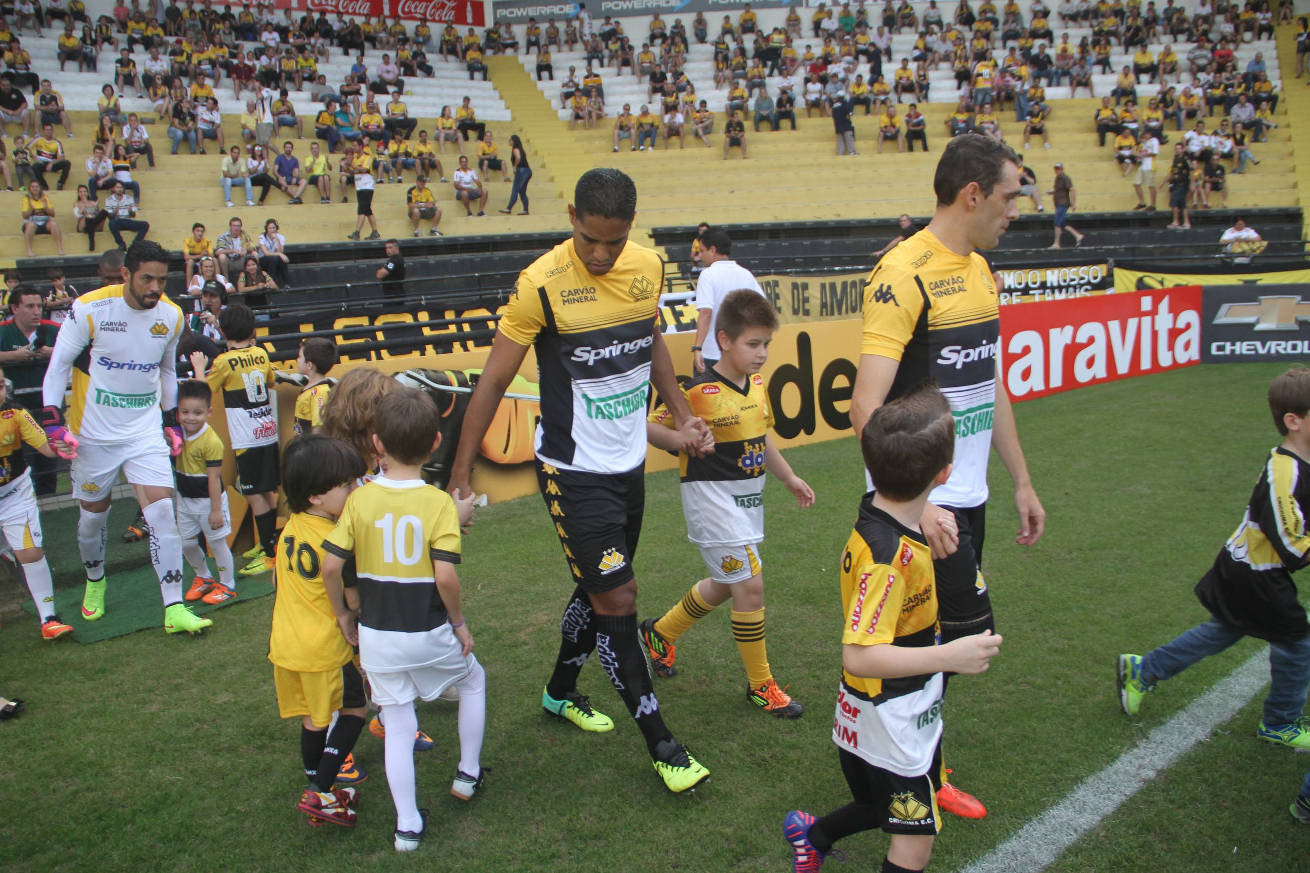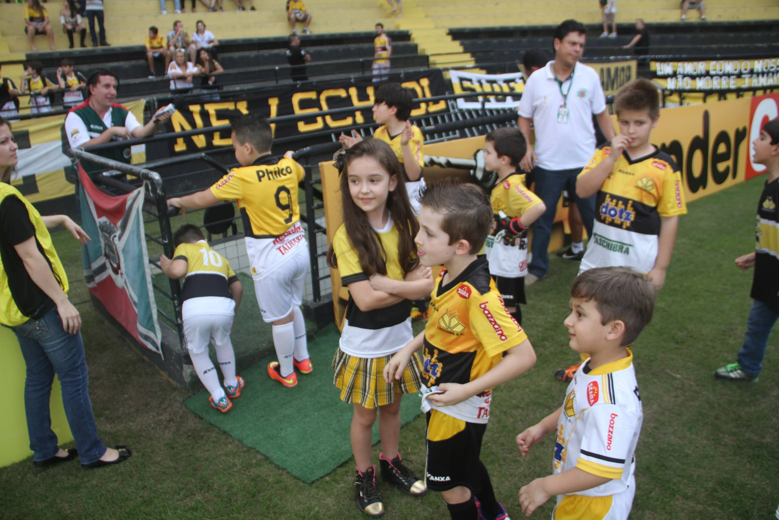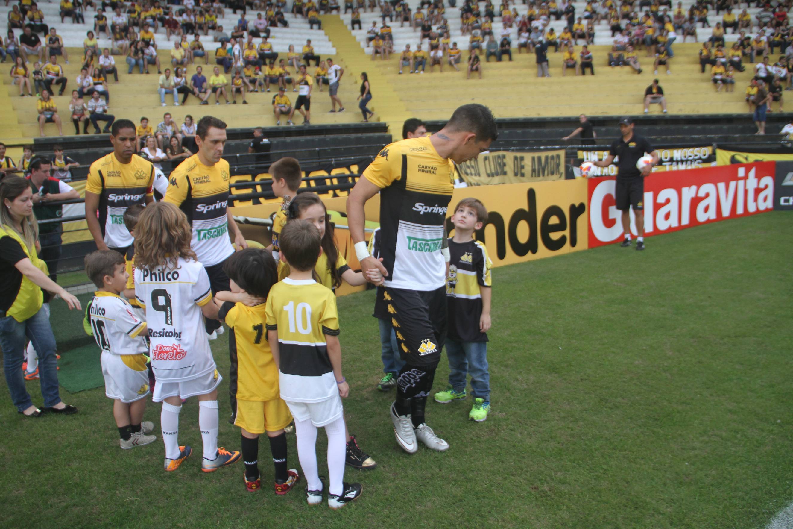 Legenda: Crianças entraram com os jogadores do Criciúma antes da partida deste sábado (06/06) contra o Macaé pelo Campeonato Brasileiro da Série B