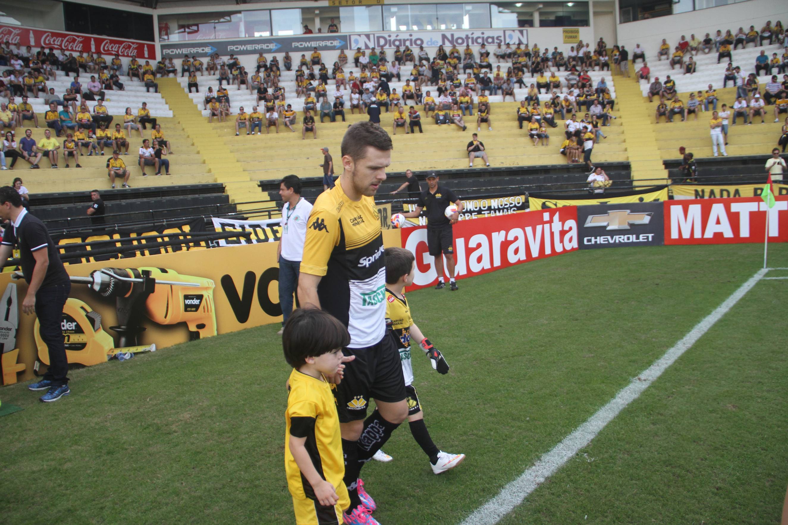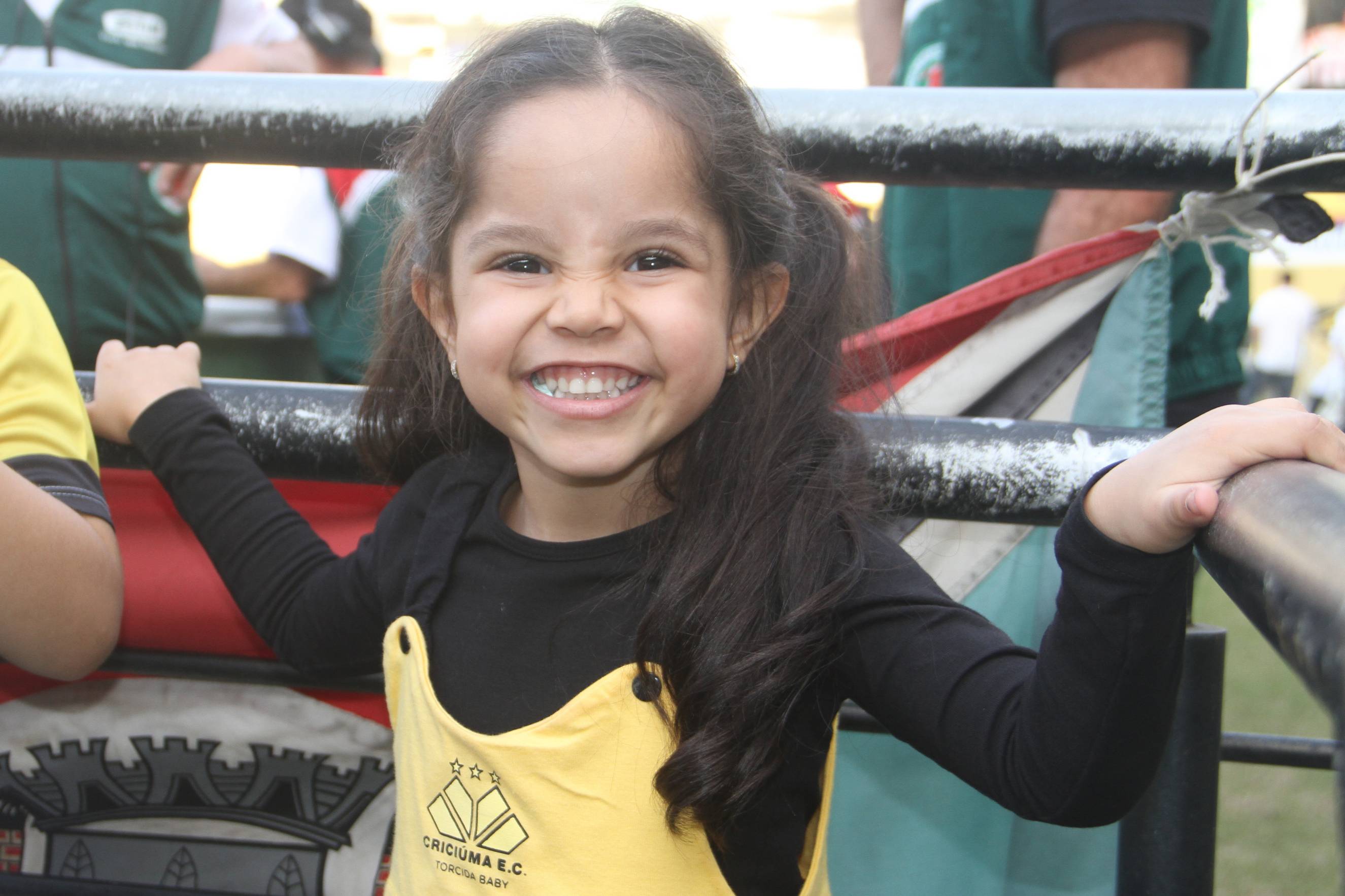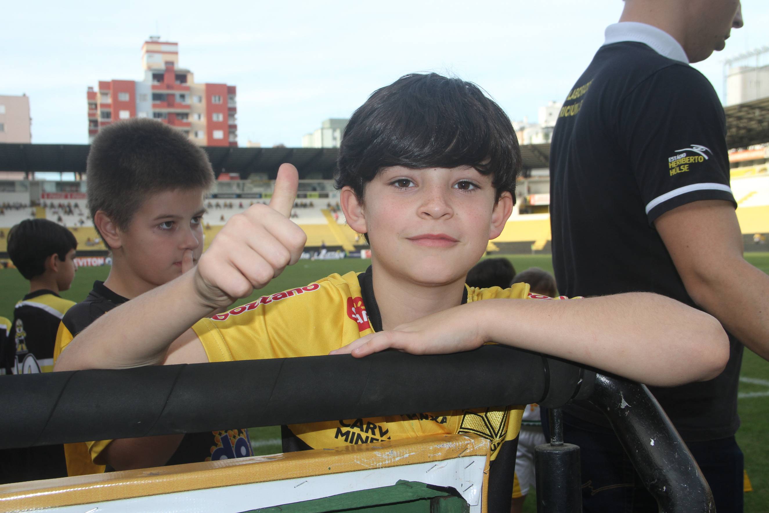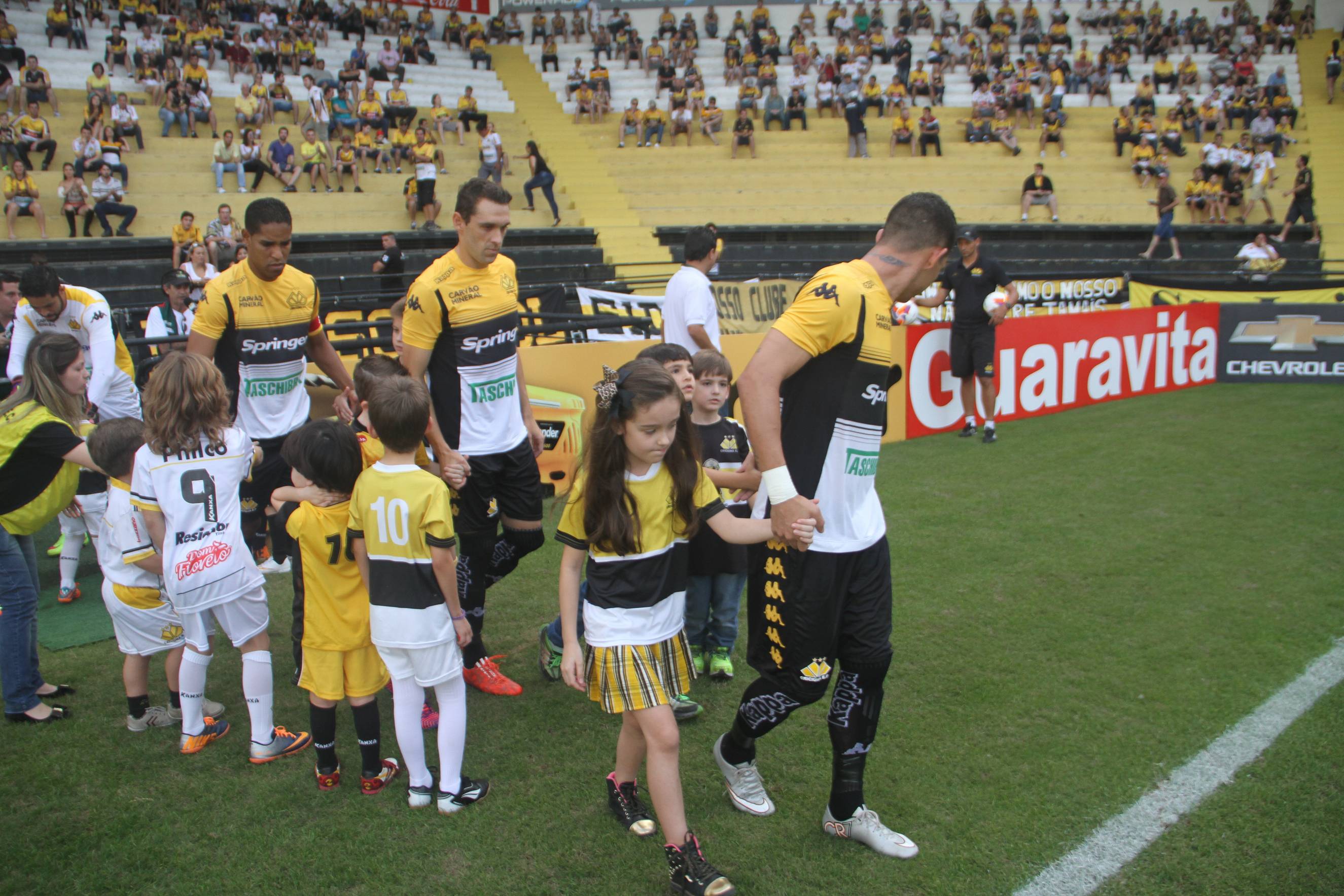 Legenda: Crianças entraram com os jogadores do Criciúma antes da partida deste sábado (06/06) contra o Macaé pelo Campeonato Brasileiro da Série B