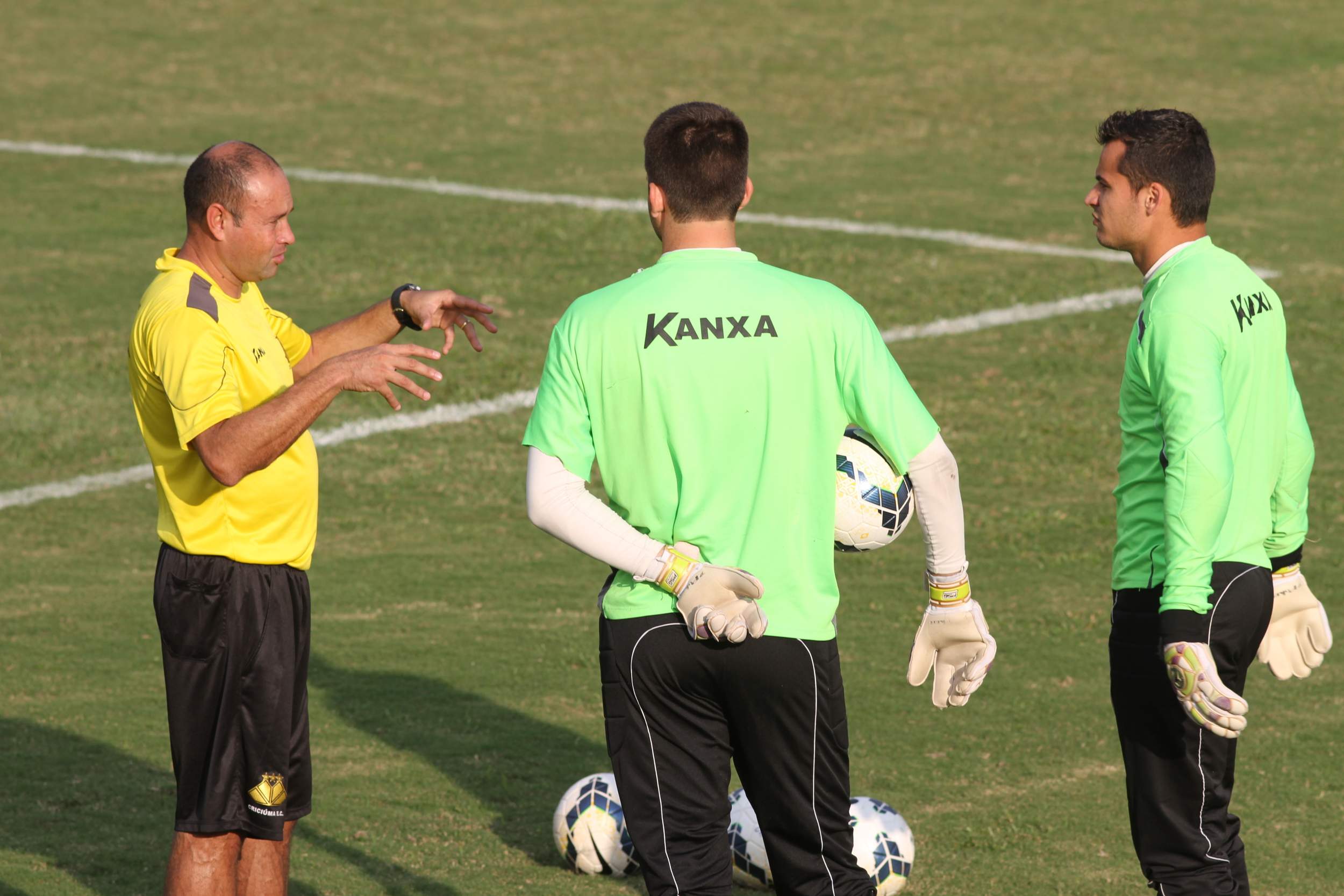 Legenda: Preparador de goleiros Rogério Maia, Galatto e Bruno durante treino no CT na tarde desta quarta-feira (14/05)
