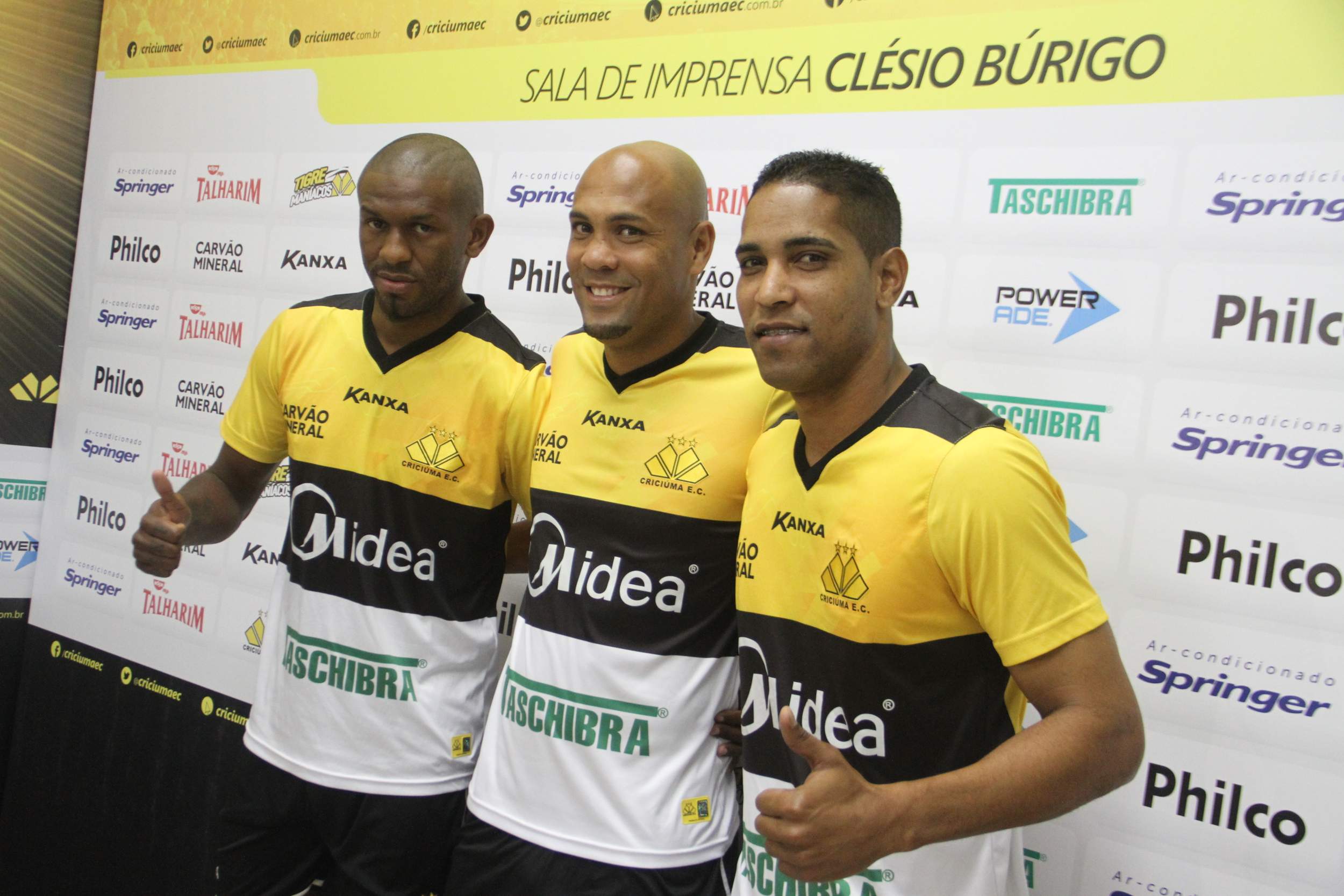 Legenda: Alcides, Souza e Cleber Santana foram apresentados oficialmente pelo Criciúma na tarde desta sexta-feira (22/08)