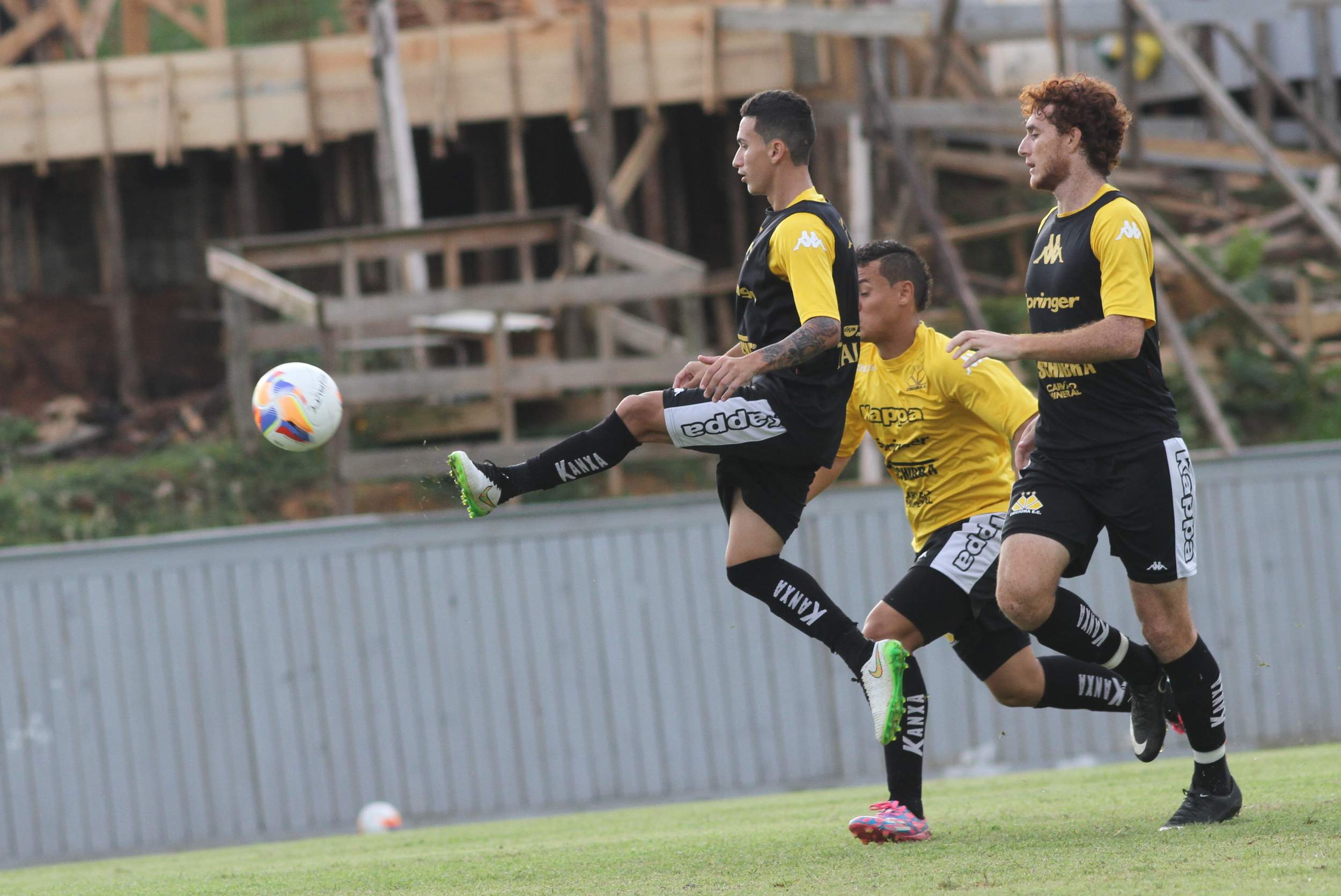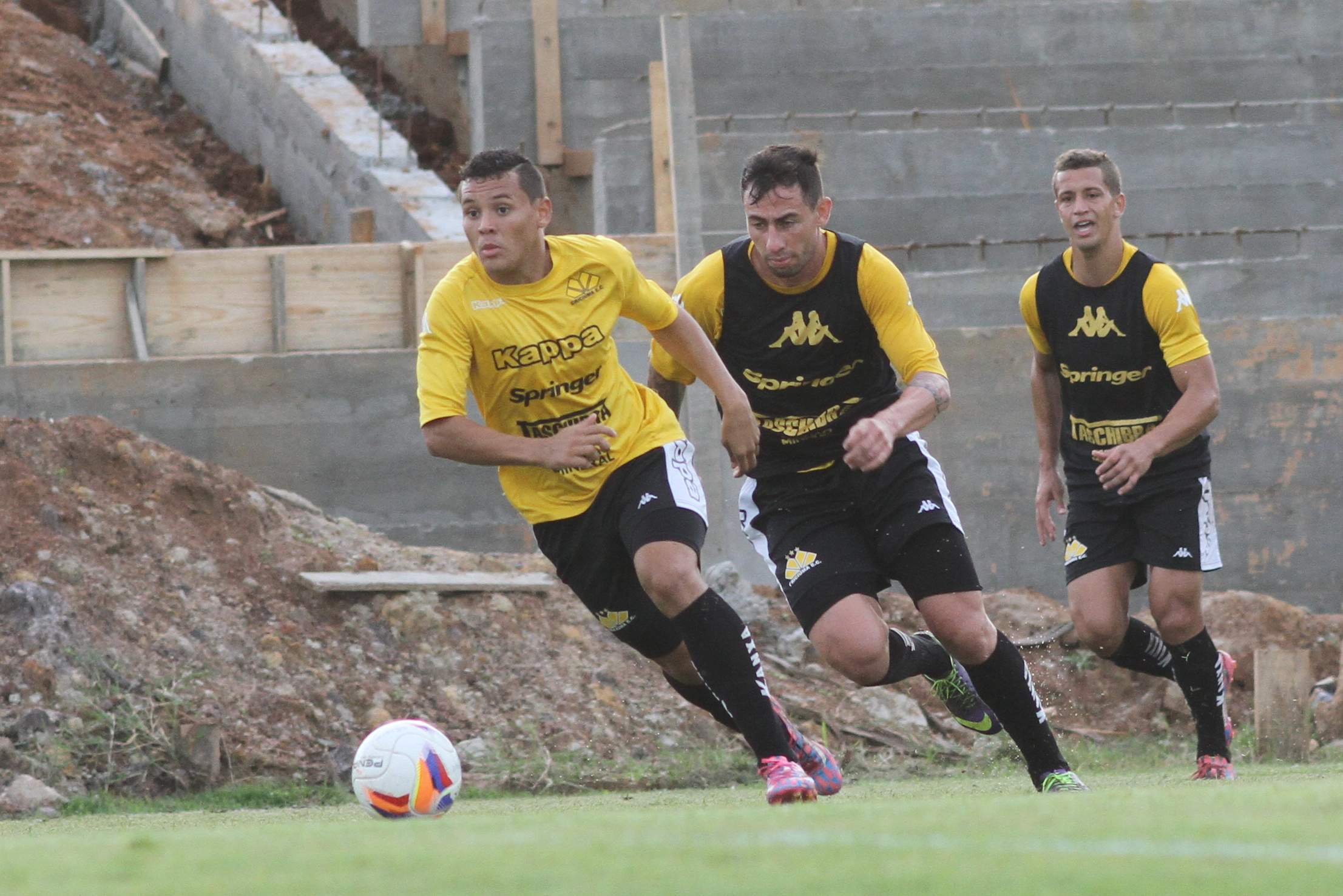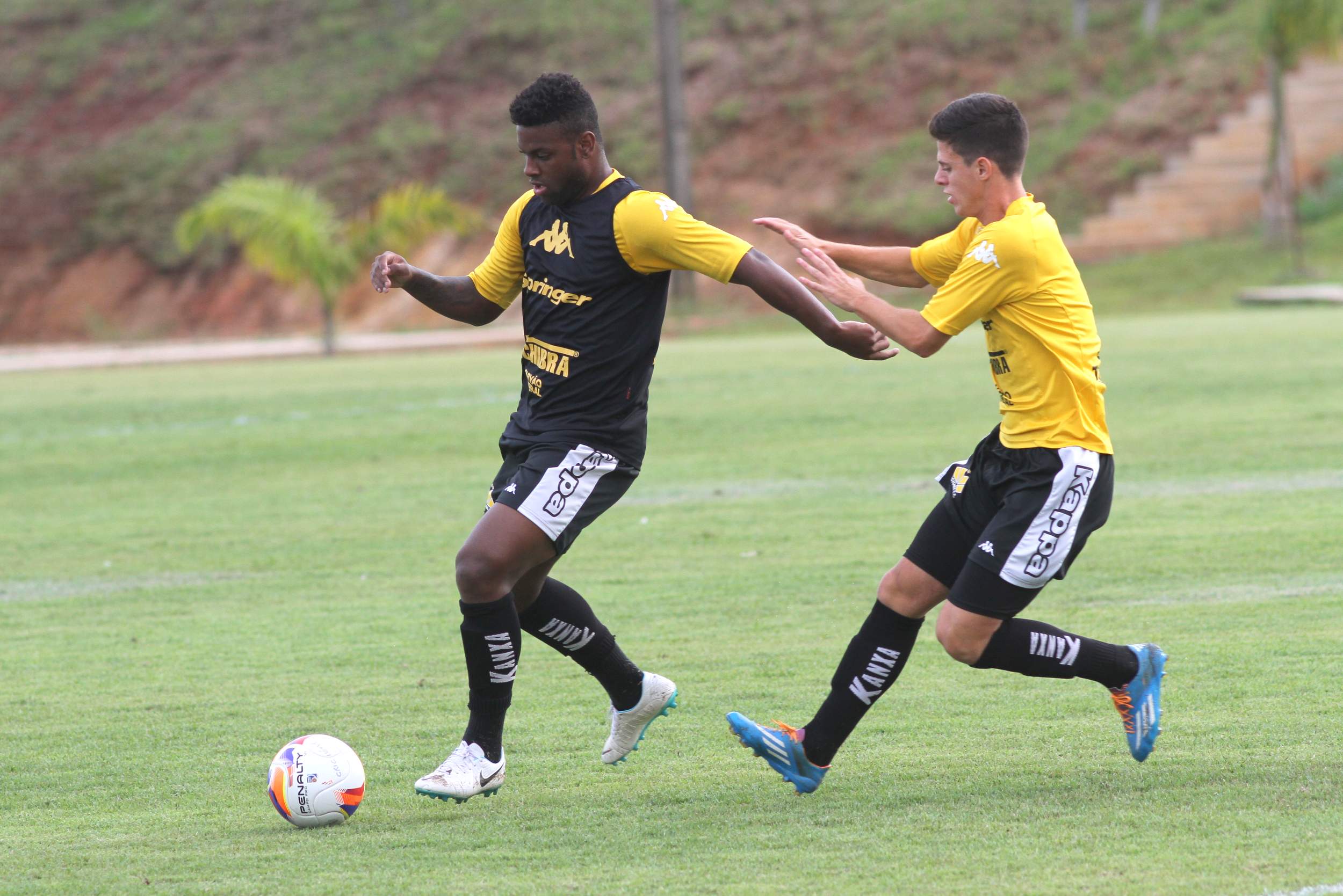 Legenda: Kalil e Rômulo durante treino do Criciúma na tarde desta sexta-feira (17/04) no Centro de Treinamento, no bairro Cristo Redentor