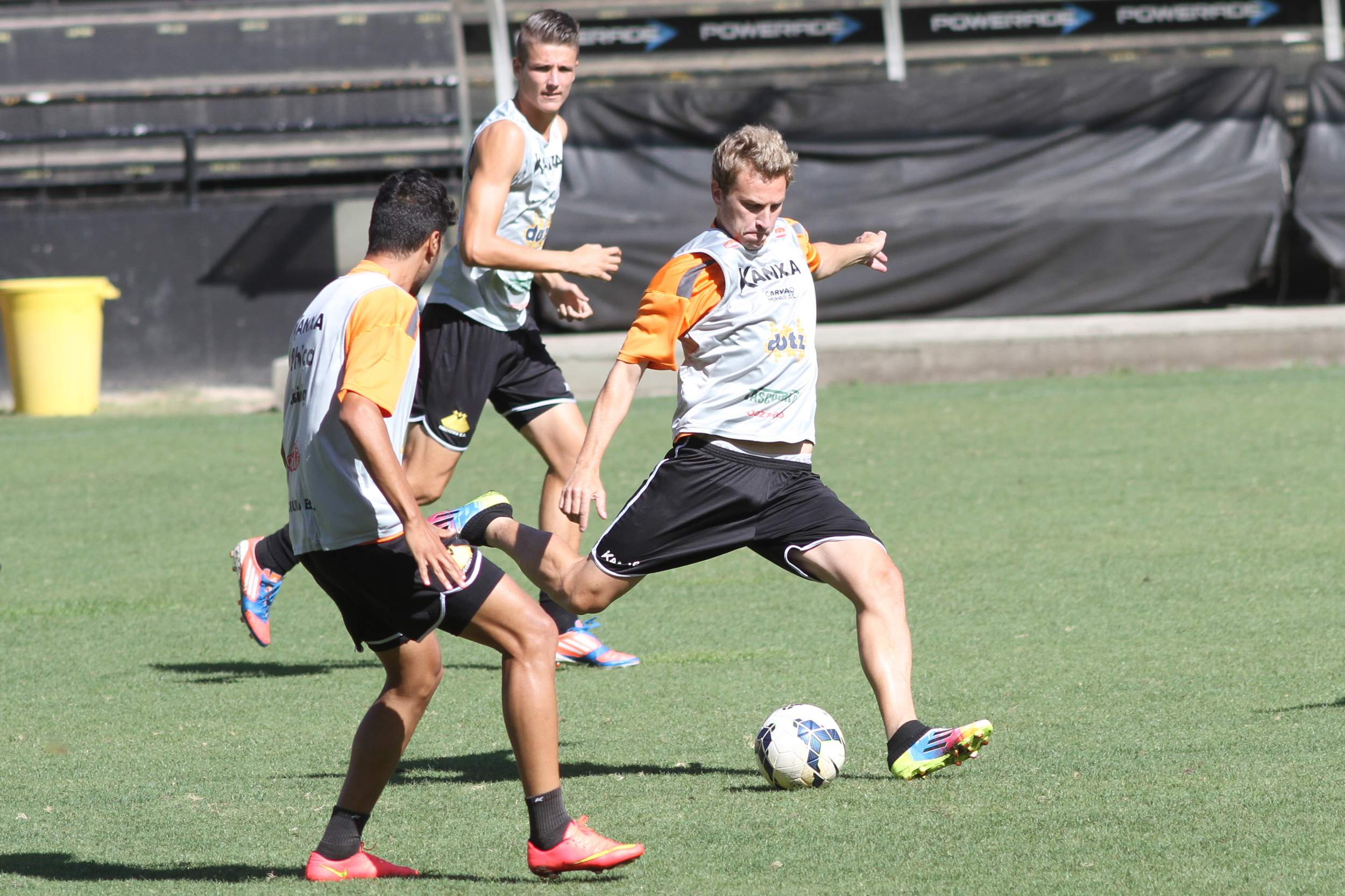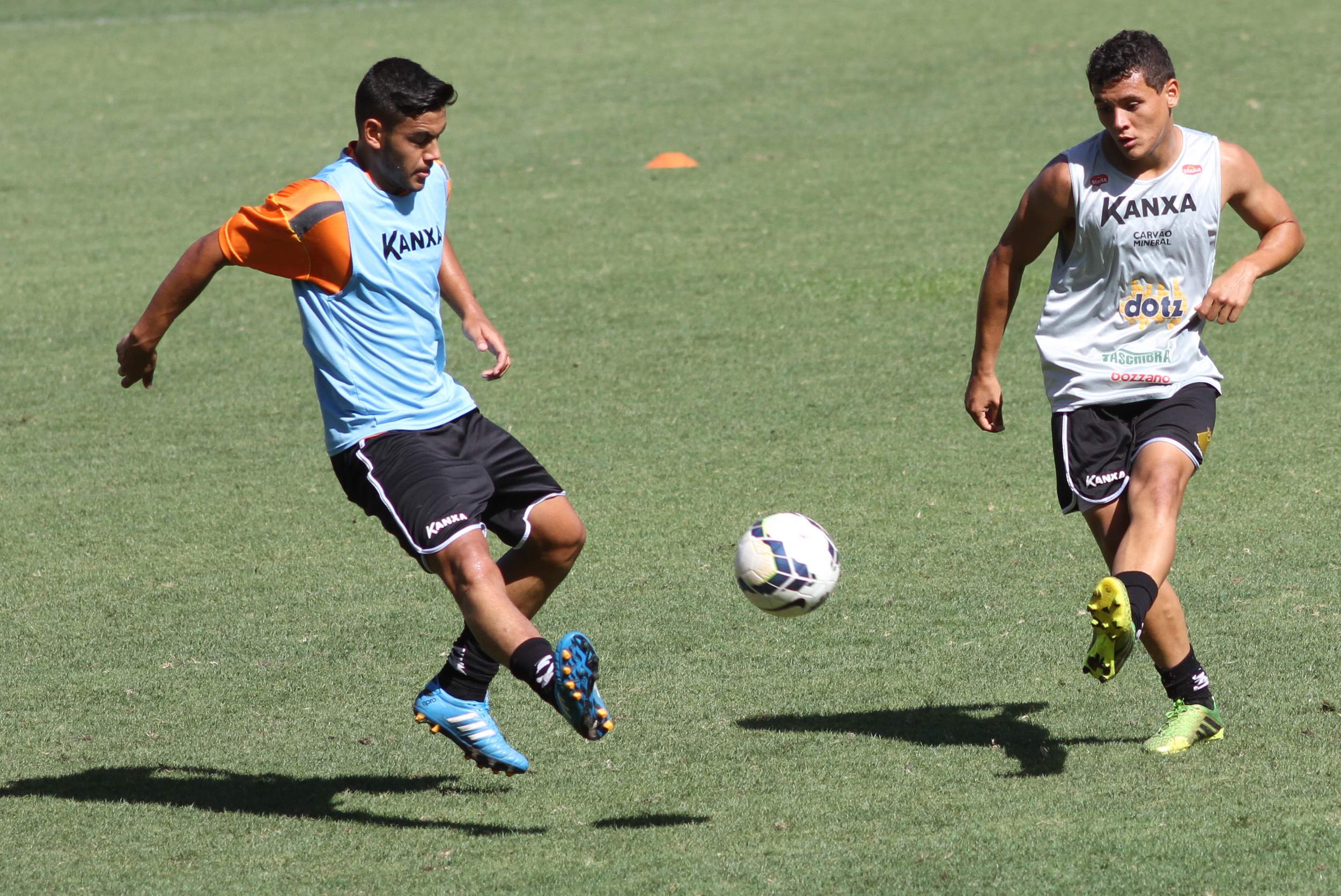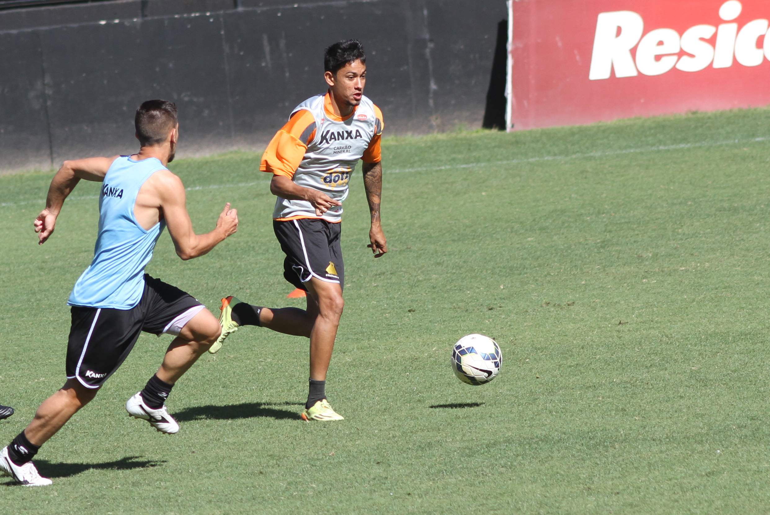 Legenda: Ricardinho e Iago Maidana durante treino do Criciúma no estádio Heriberto Hülse na manhã desta sexta-feira (05/12)