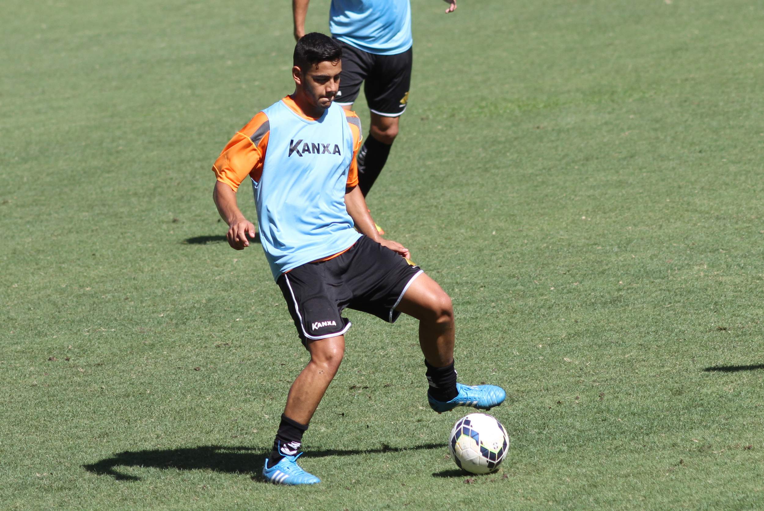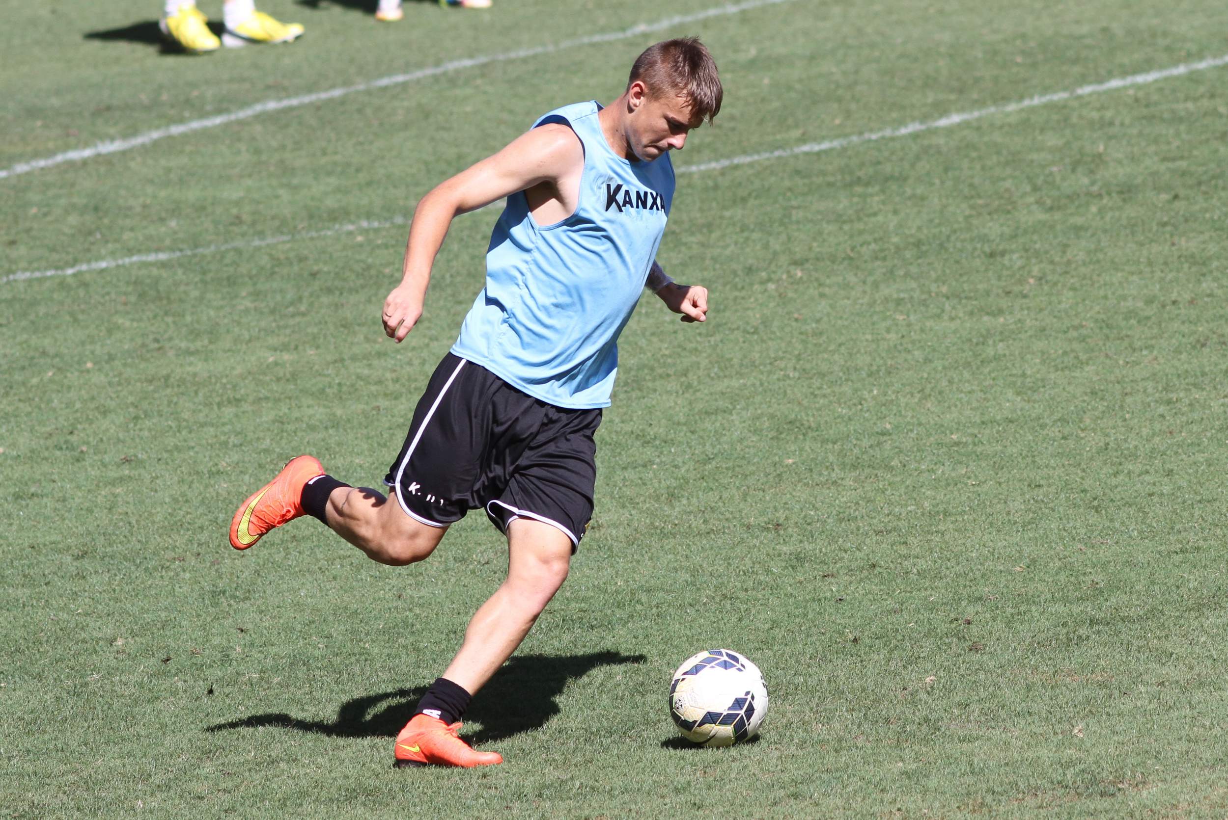 Legenda: Atacante Roger durante treino do Criciúma no estádio Heriberto Hülse na manhã desta sexta-feira (05/12)