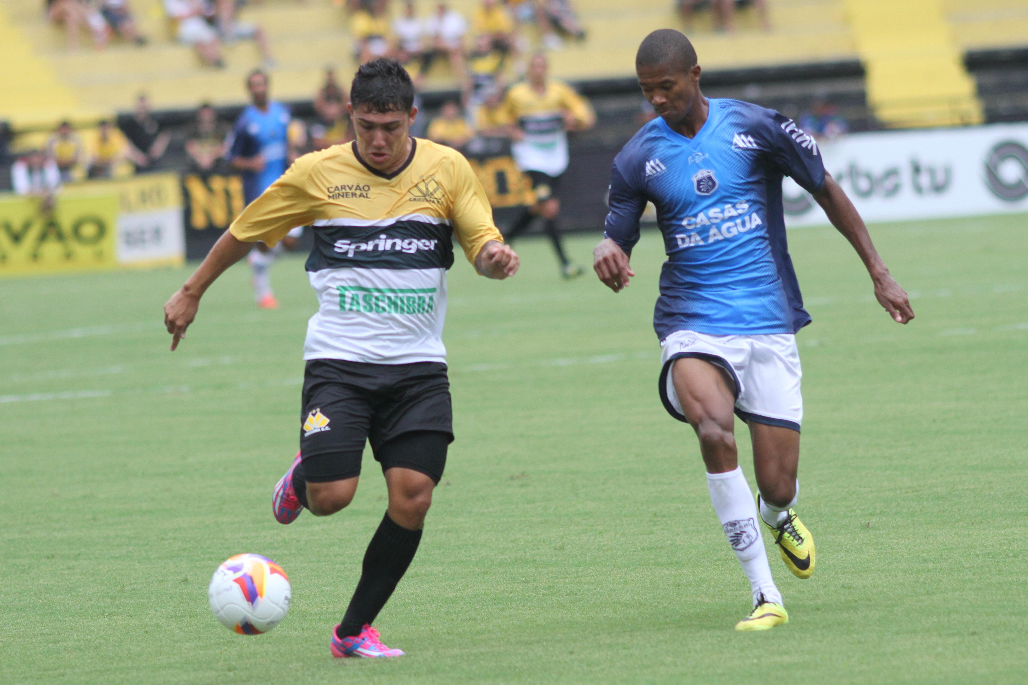 Legenda: Meia atacante Roger em lance durante o jogo entre Criciúma e Guarani pela primeira rodada do Campeonato Catarinense na tarde deste sábado (31/01) no estádio Heriberto Hülse