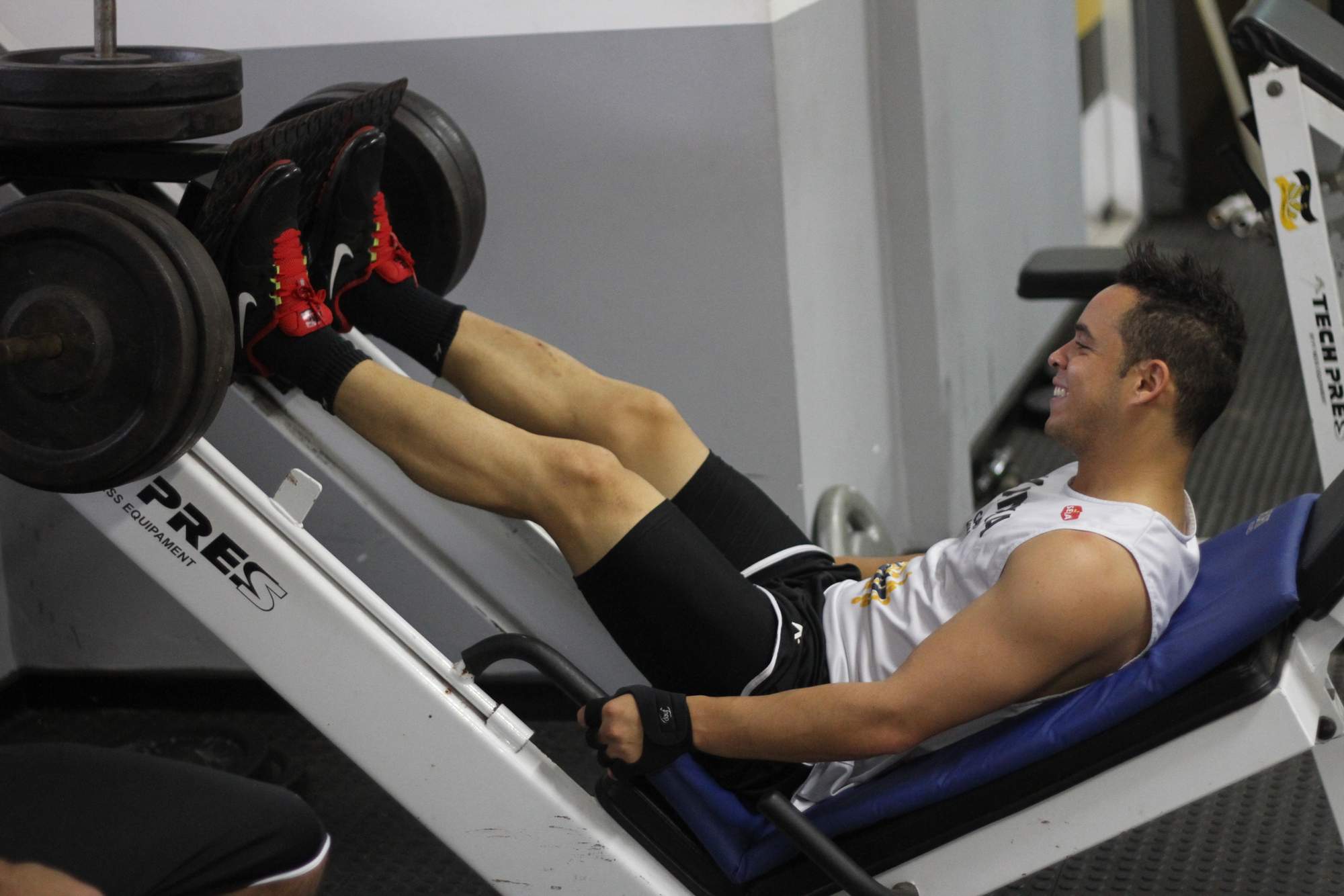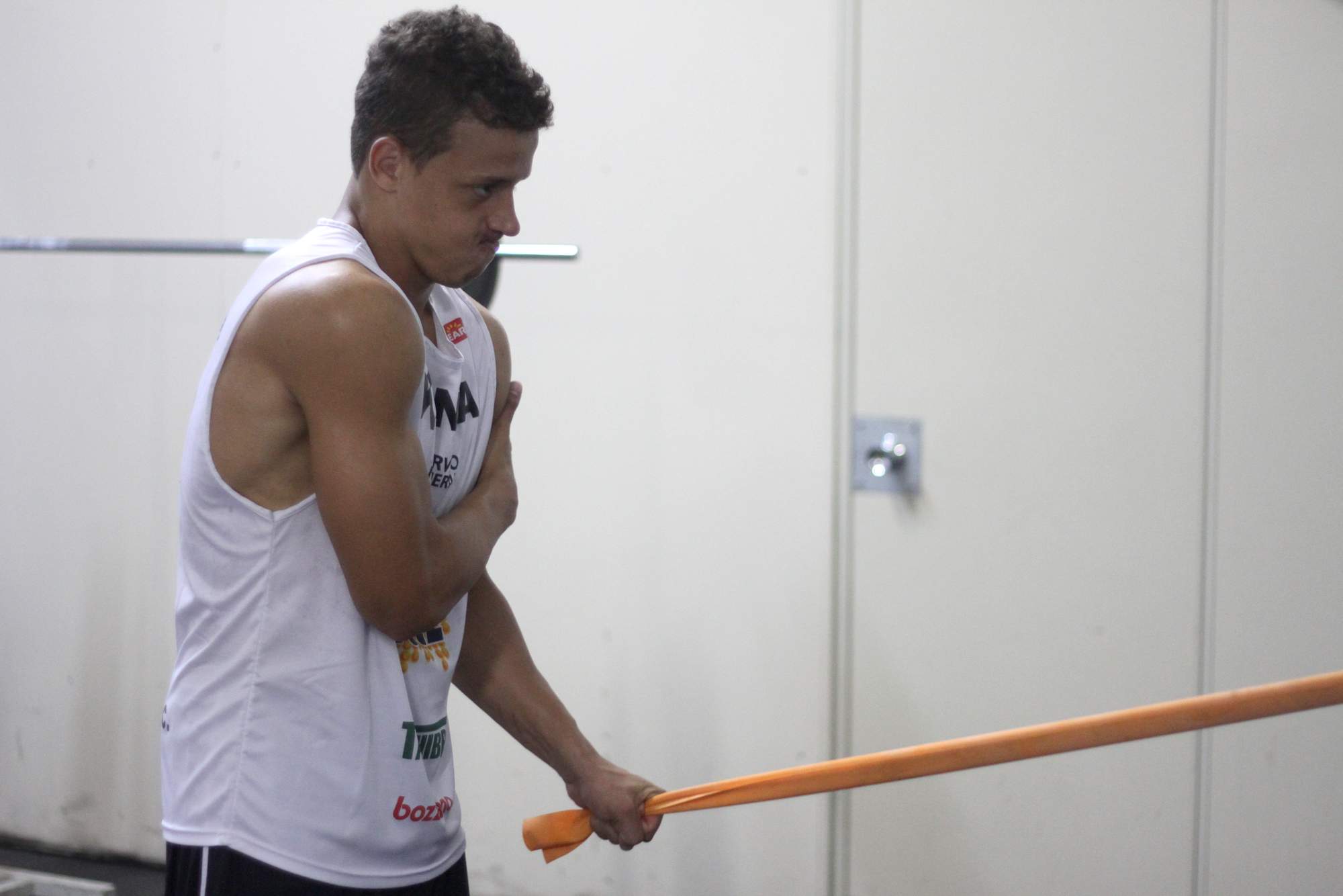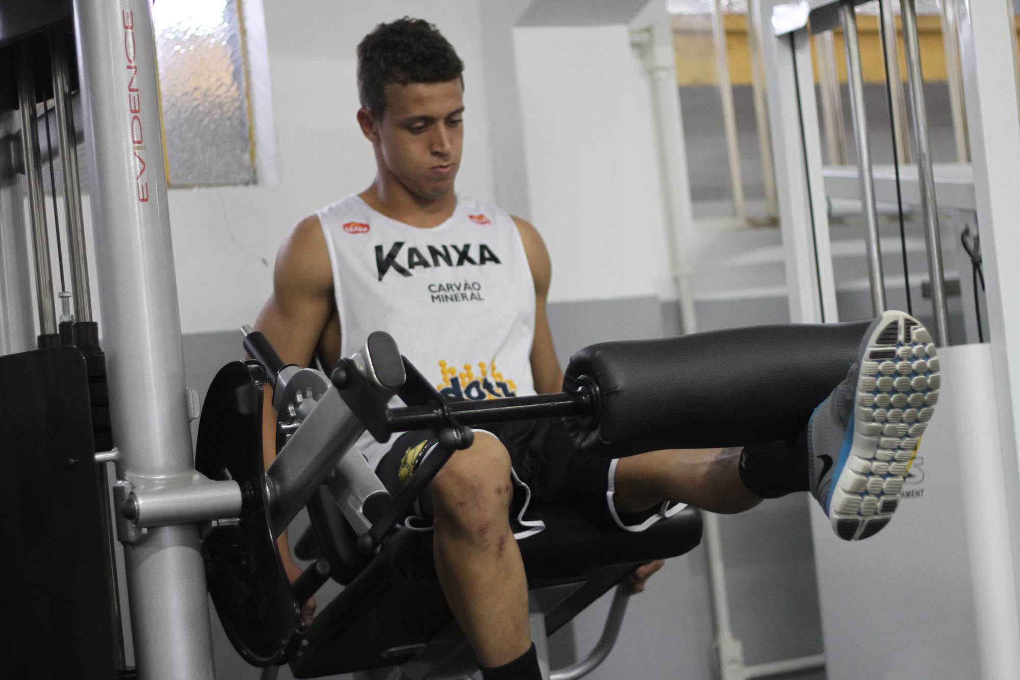 Legenda: Lateral esquerdo Rômulo durante treino na academia do estádio Heriberto Hülse na tarde desta segunda-feira (10/03)