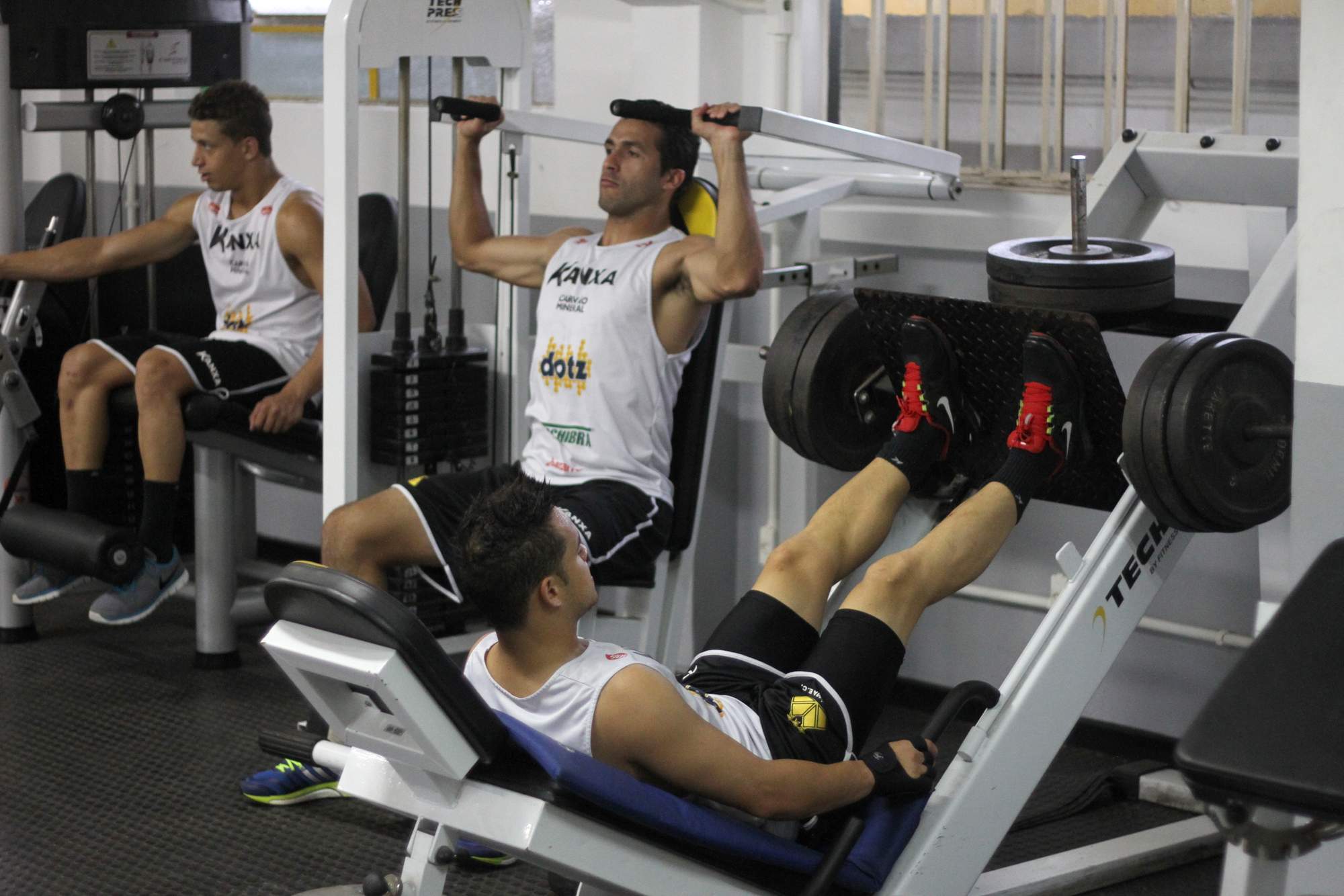 Legenda: Atletas do Tigre durante treino na academia do estádio Heriberto Hülse na tarde desta segunda-feira (10/03)