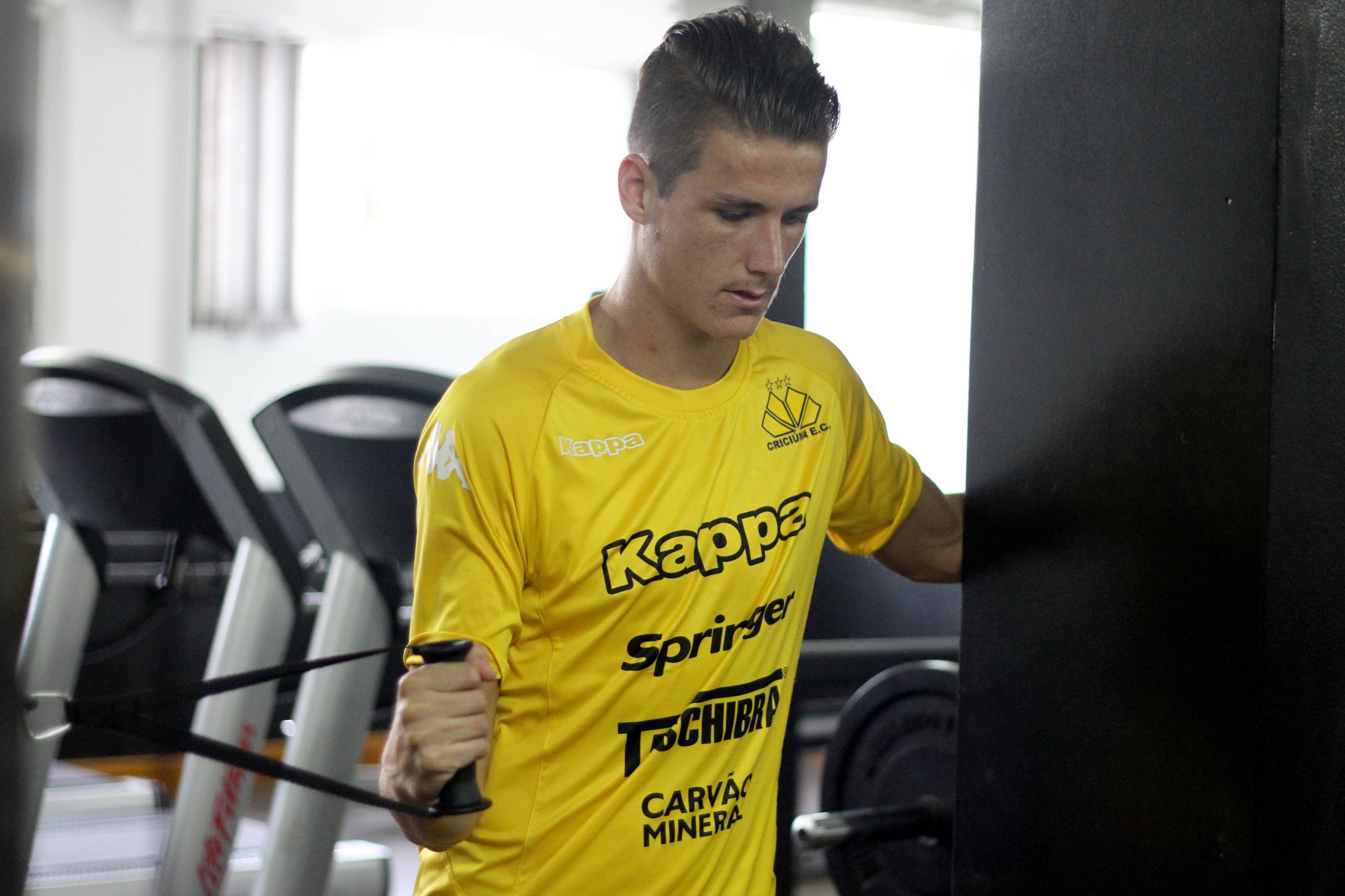 Legenda: Lateral direito Maicon Silva durante treino do Criciúma na manhã desta segunda-feira (09/03) na academia do estádio Heriberto Hülse