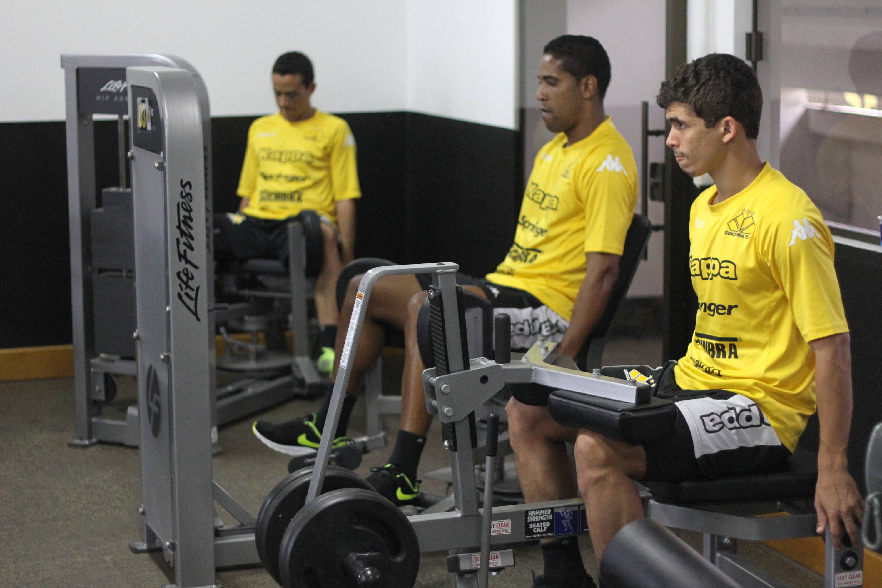 Legenda: Tarracha, Cleber Santana e Natan durante treino do Criciúma na manhã desta segunda-feira (09/03) na academia do estádio Heriberto Hülse
