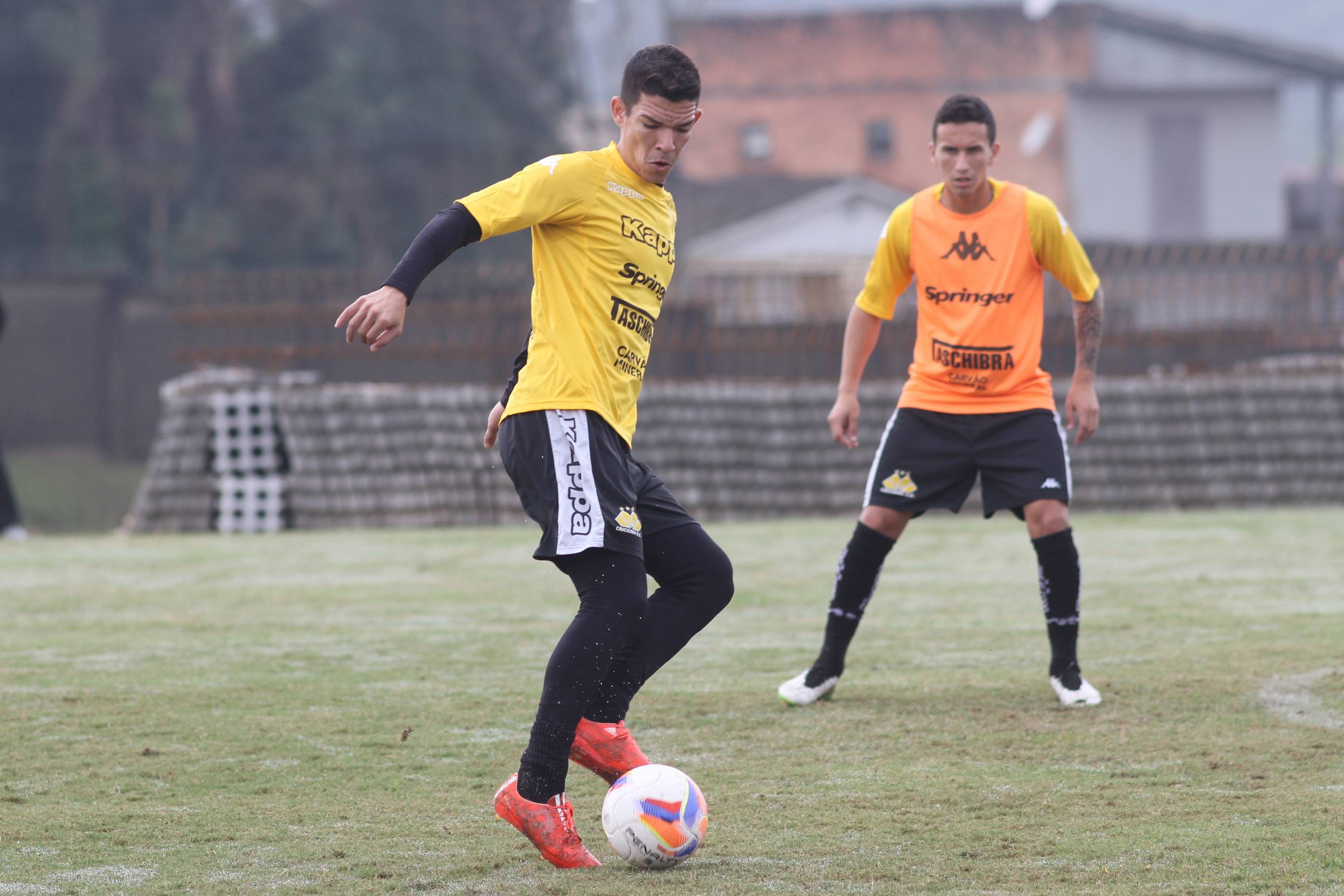 Legenda: Rodrigo Andrade e Douglas Moreira durante treino do Criciúma na manhã desta sexta-feira (17/07) no Centro de Treinamento, no bairro Cristo Redentor