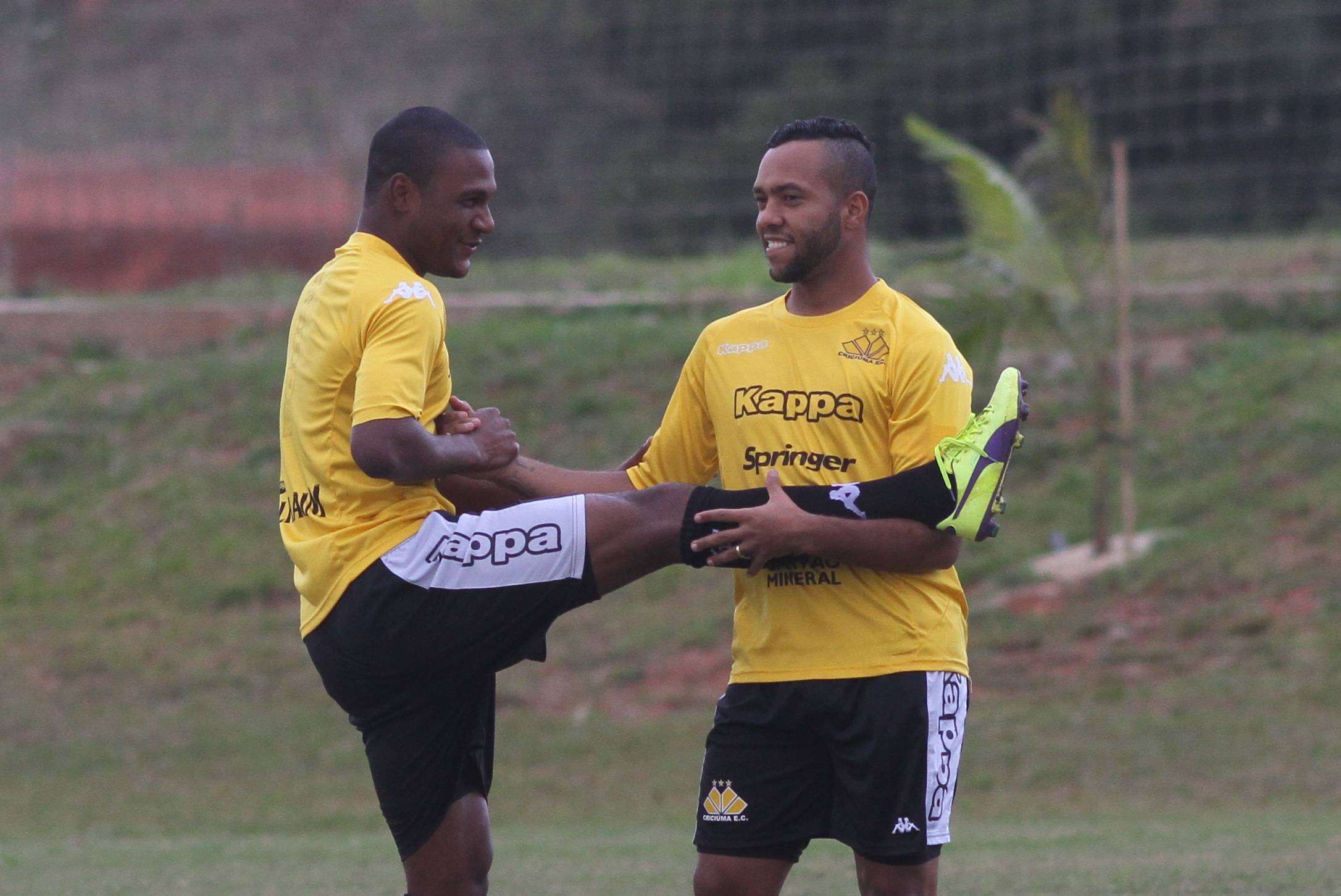 Legenda: Wellington e Paulinho durante treino do Criciúma na tarde desta segunda-feira (03/08), no Centro de Treinamento, no bairro Cristo Redentor