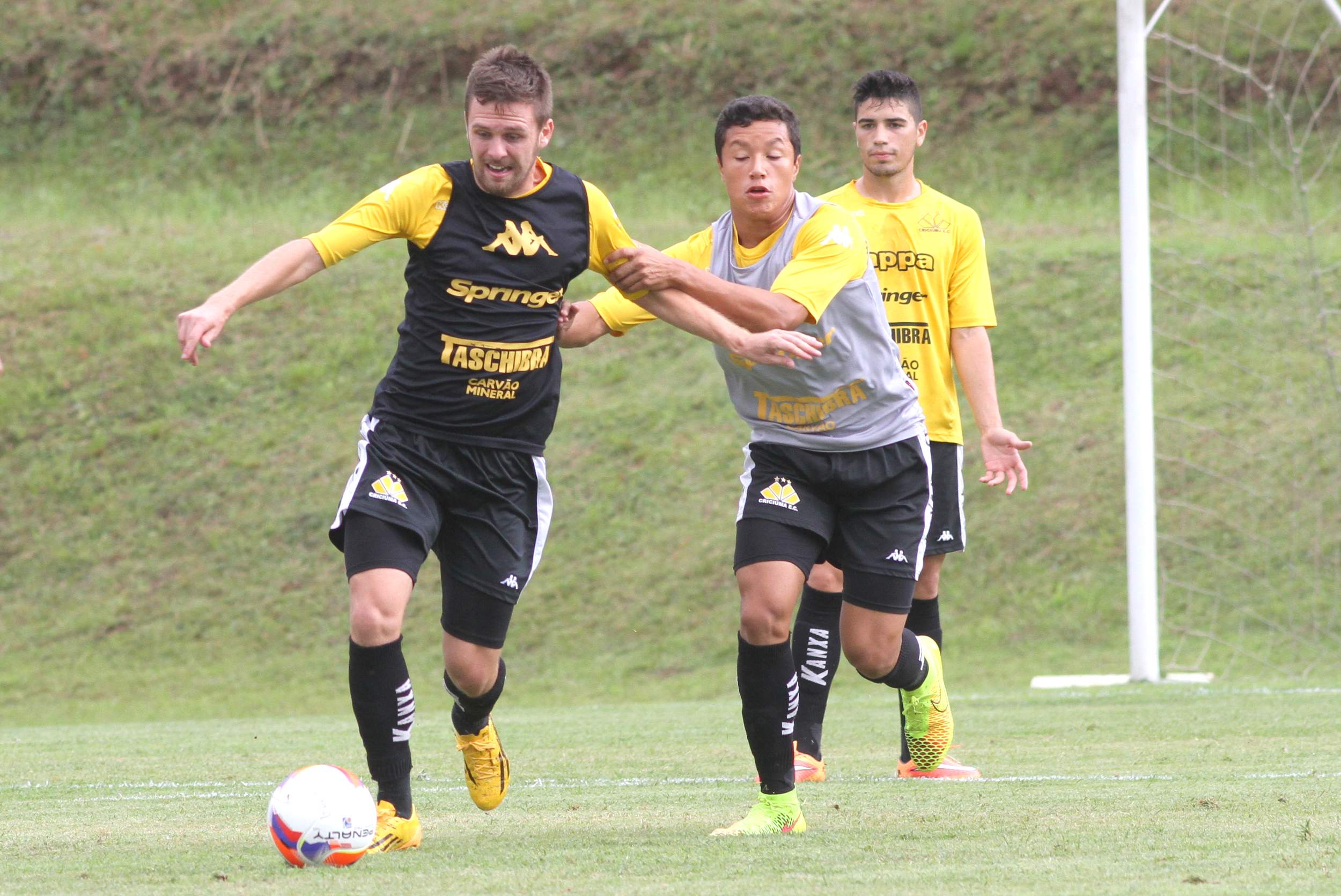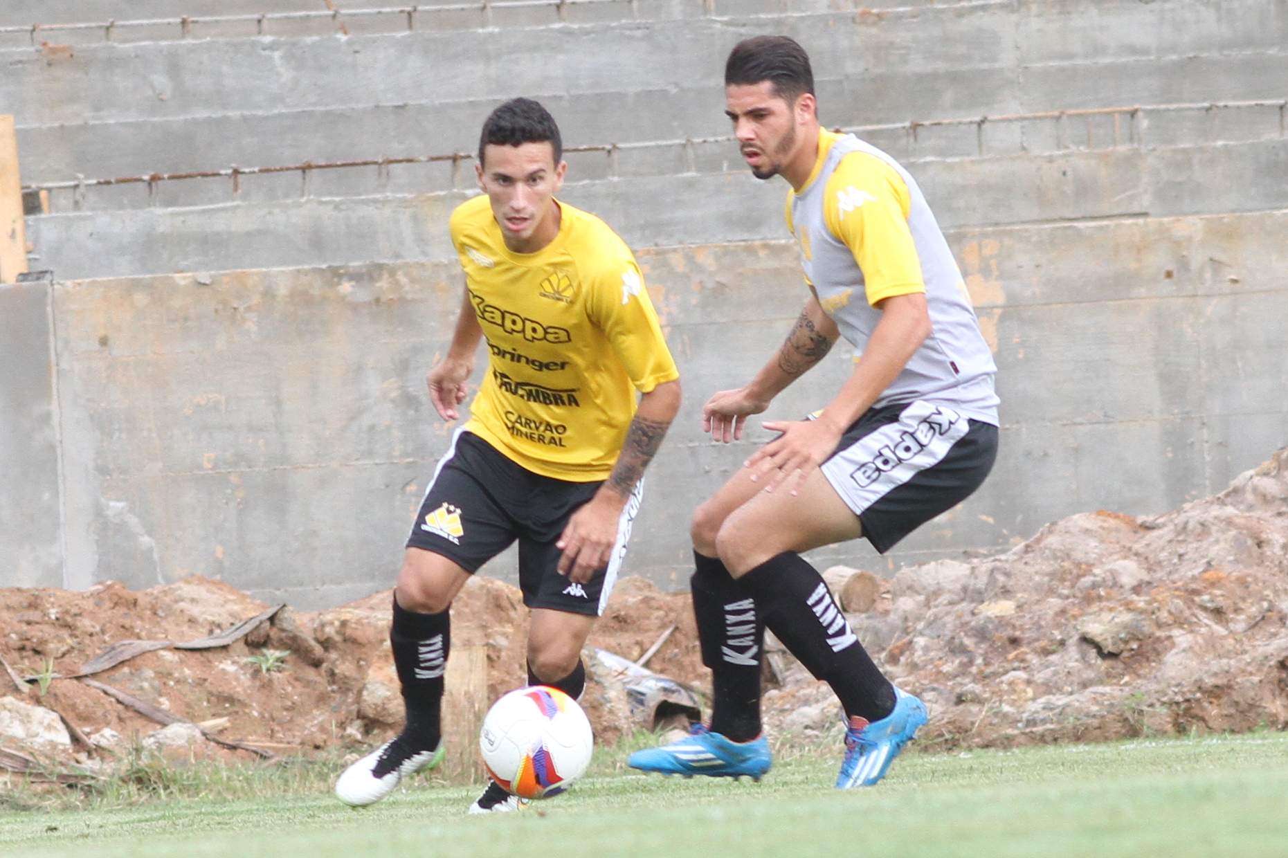 Legenda: Douglas Moreira e Kalil durante treino do Criciúma na manhã desta quinta-feira (16/04) no Centro de Treinamento no bairro Cristo Redentor