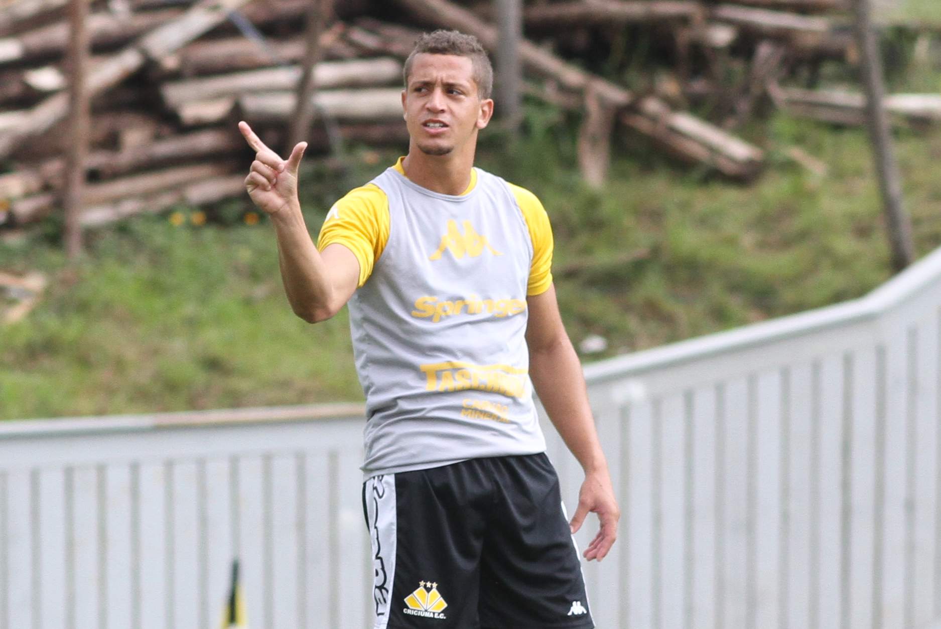 Legenda: Atacante Silvinho durante treino do Criciúma na manhã desta quinta-feira (16/04) no Centro de Treinamento no bairro Cristo Redentor