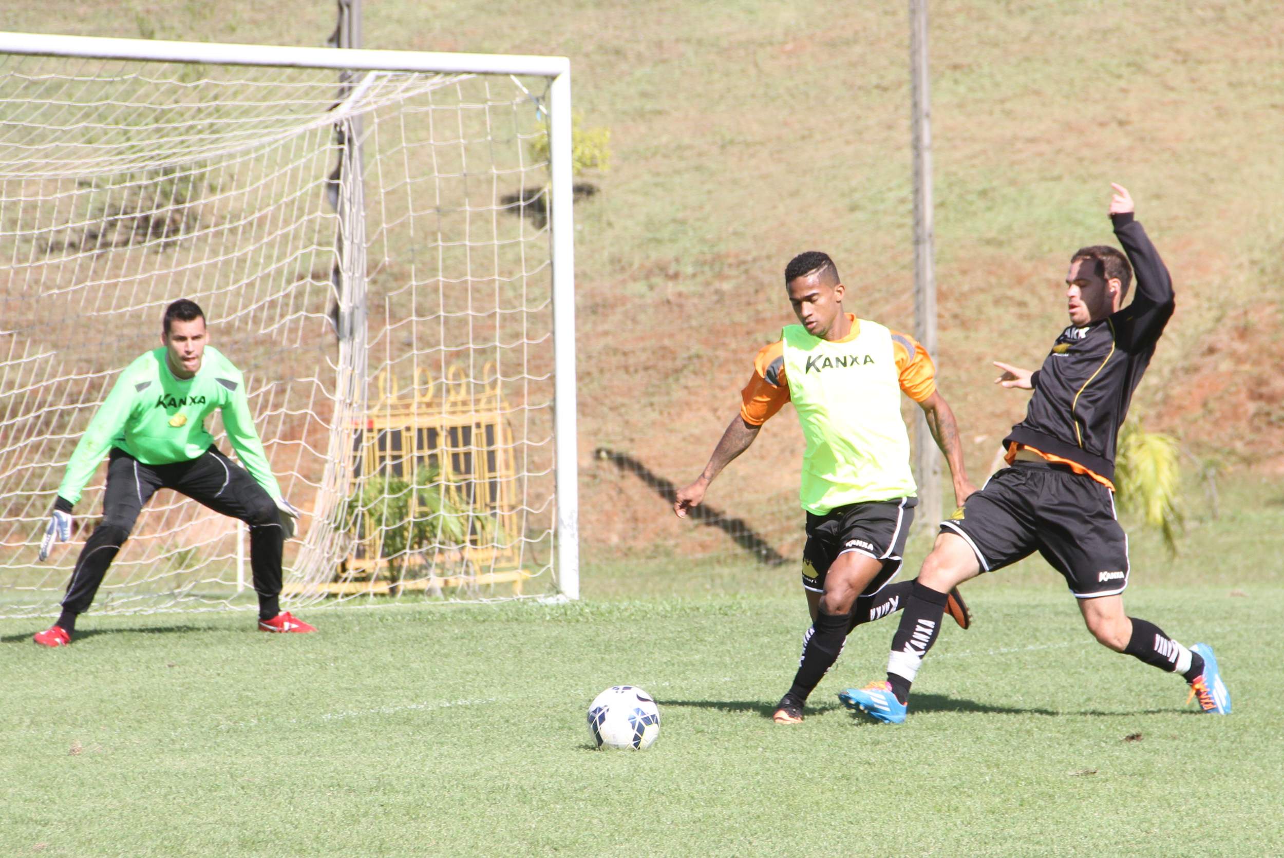 Legenda: Goleiro Bruno, lateral direito Eduardo e atacante Silvinho durante treino no CT na manhã desta sexta-feira (25/04)
