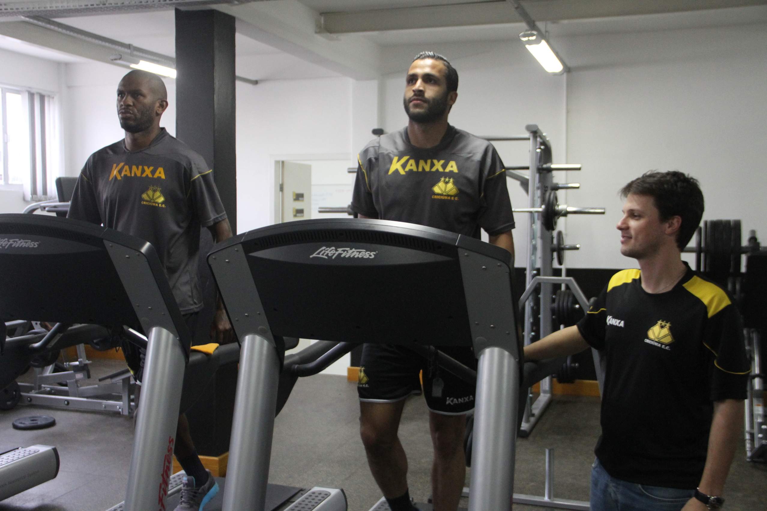 Legenda: Zagueiros Alcides e Ronaldo Alves e o fisioterapeuta Bruno Conti durante treino na academia do estádio Heriberto Hülse na tarde desta quinta-feira (18/09)