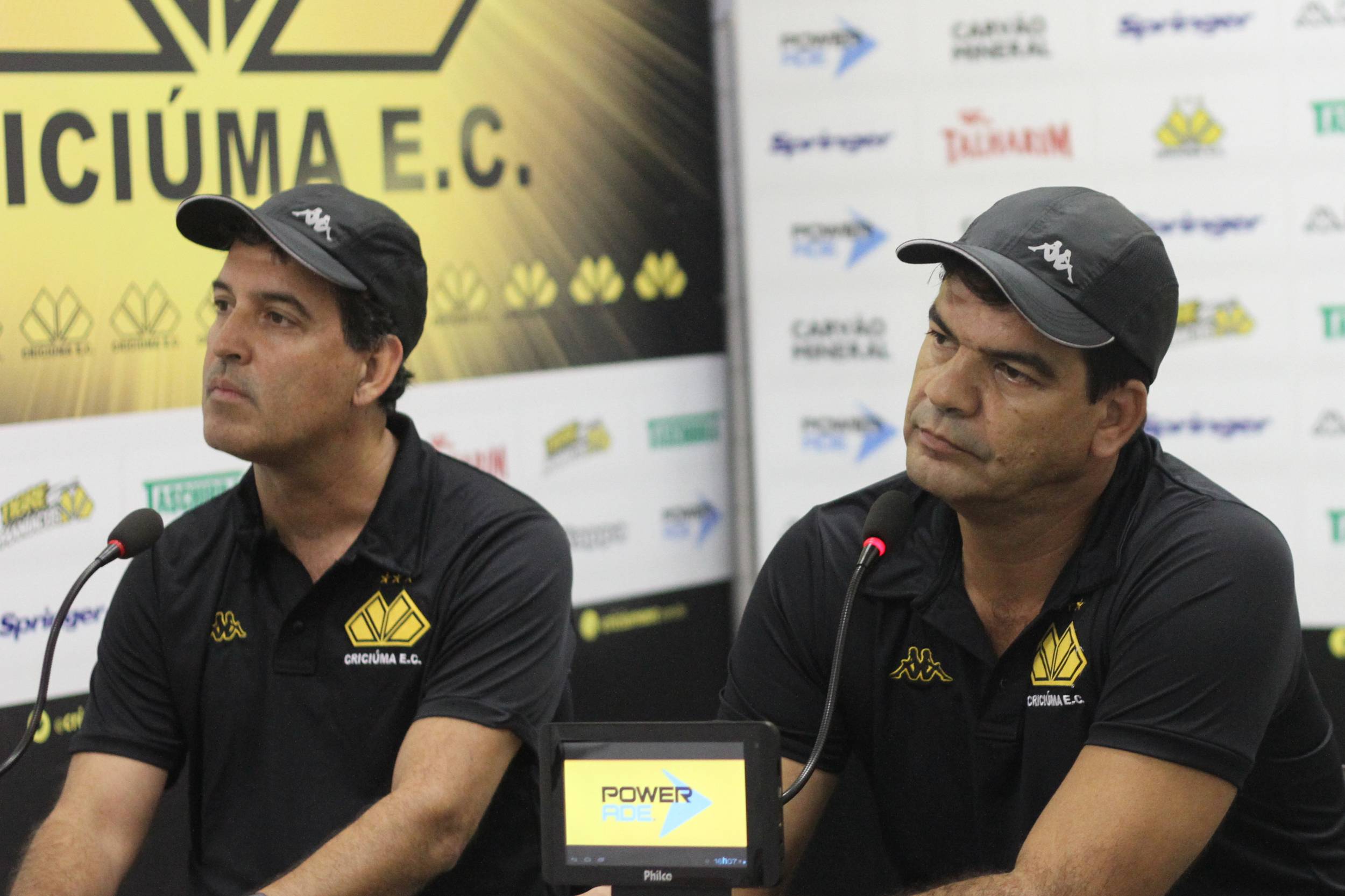 Legenda: Auxiliar técnico Altair Coimbra (E) e o técnico Moacir Júnior (D) durante entrevista coletiva realizada na sala de imprensa do estádio Heriberto Hülse na tarde desta quarta-feira (15/04)
