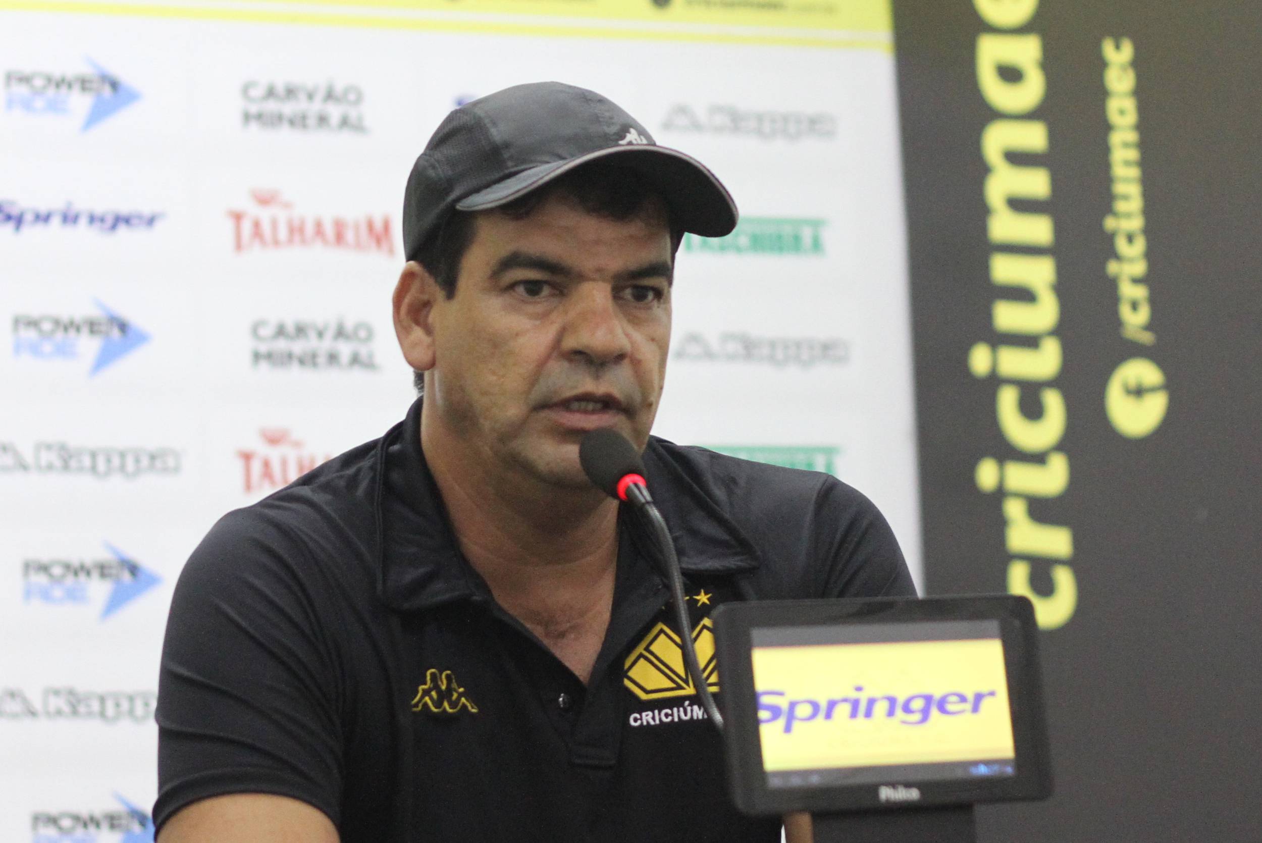Legenda: Técnico Moacir Júnior durante entrevista coletiva realizada na sala de imprensa do estádio Heriberto Hülse na tarde desta quarta-feira (15/04)