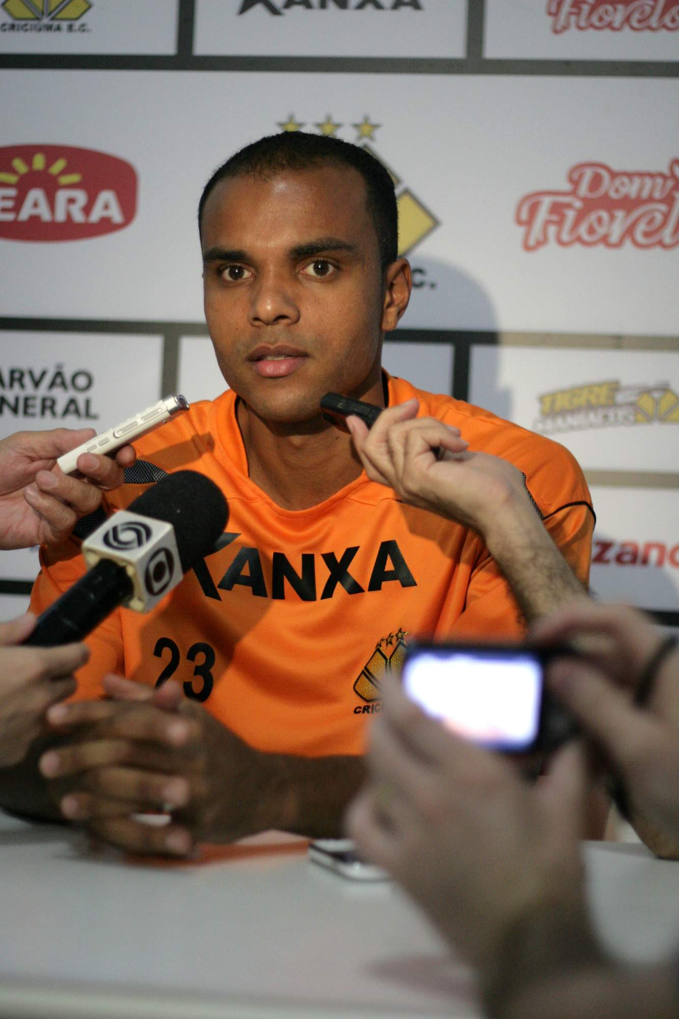 Legenda: Entrevista coletiva com o lateral direito Eric, na tarde desta terça-feira (20/11), na sala de imprensa do estádio Heriberto Hülse