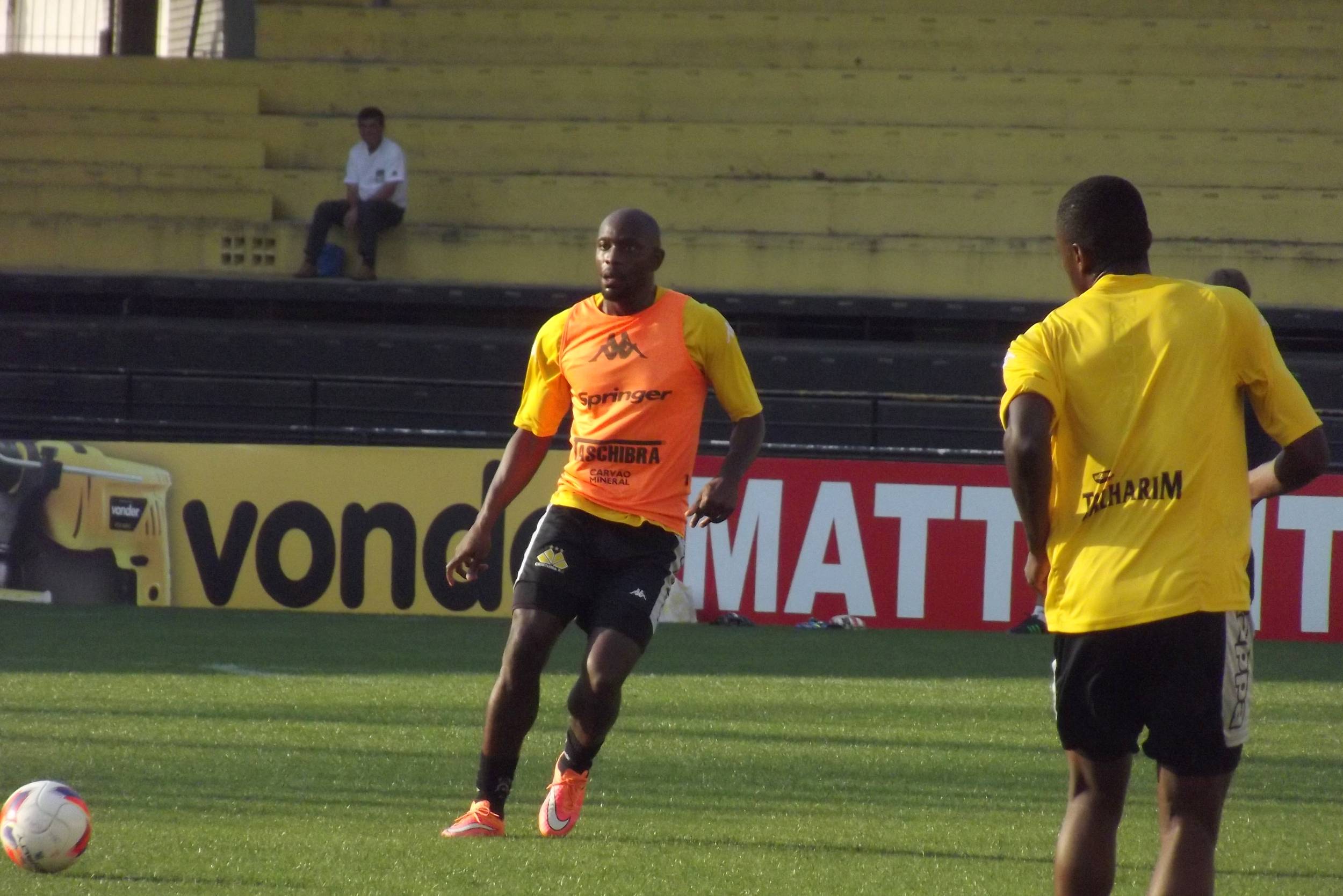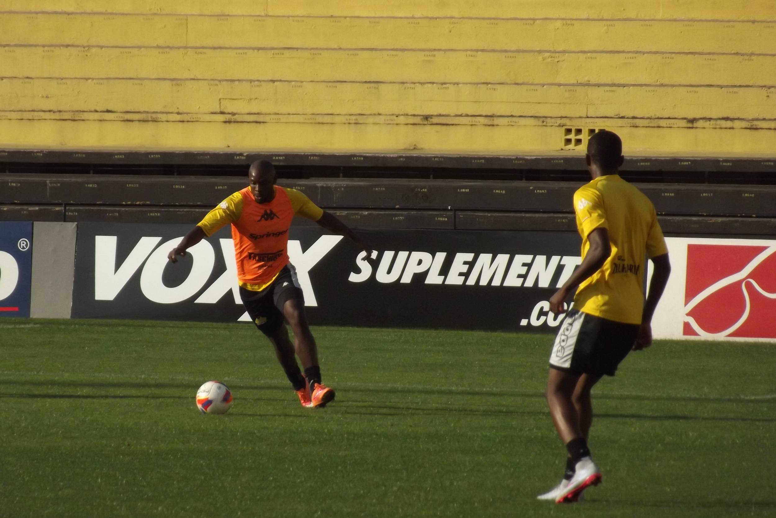 Legenda: Atacante Juba durante o treino desta segunda-feira (31/08), no estádio Heriberto Hülse.