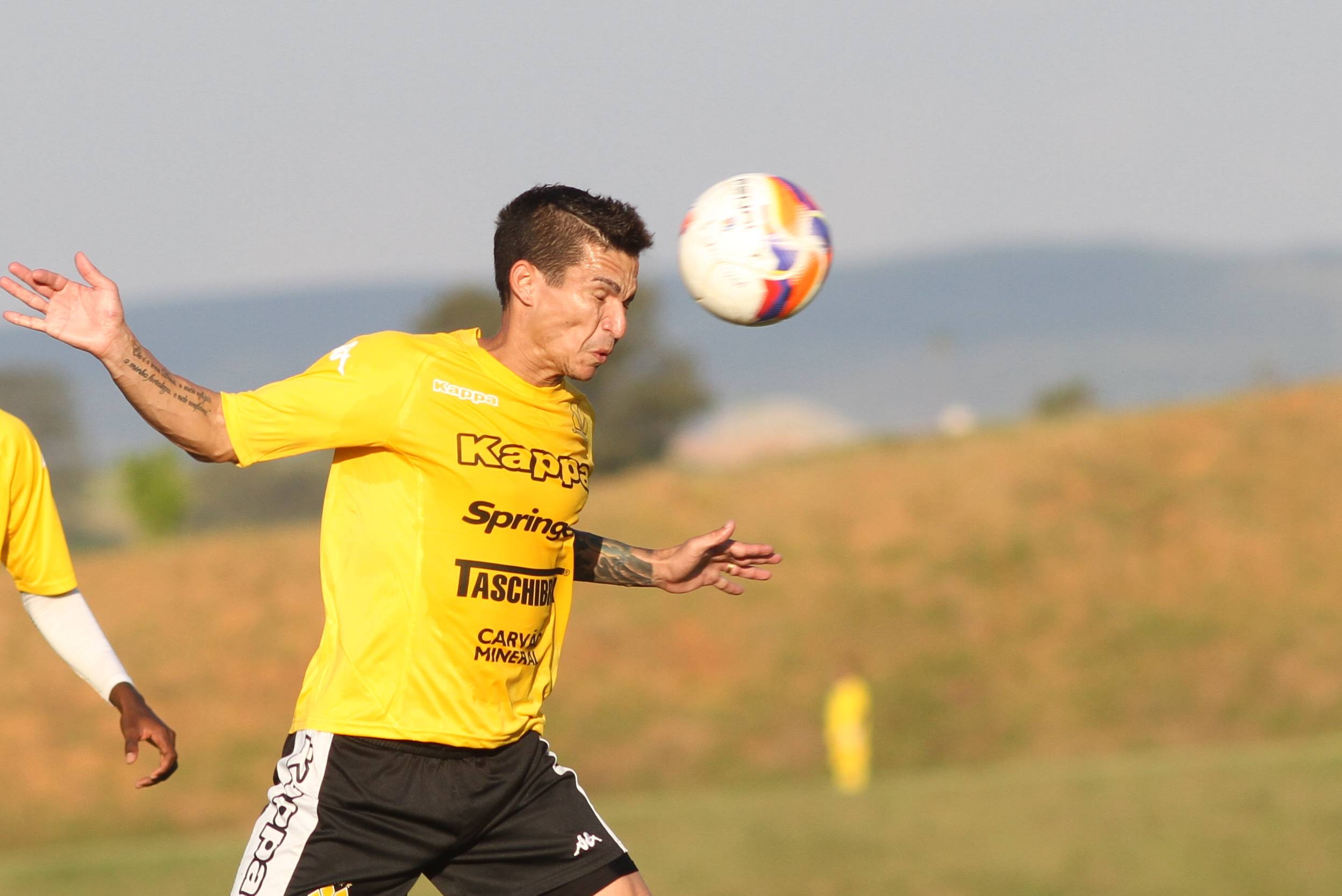 Legenda: Róger Guedes durante treino do Criciúma na tarde deste sábado (02/05) no Centro de Treinamento do Atlético Sorocaba (SP)