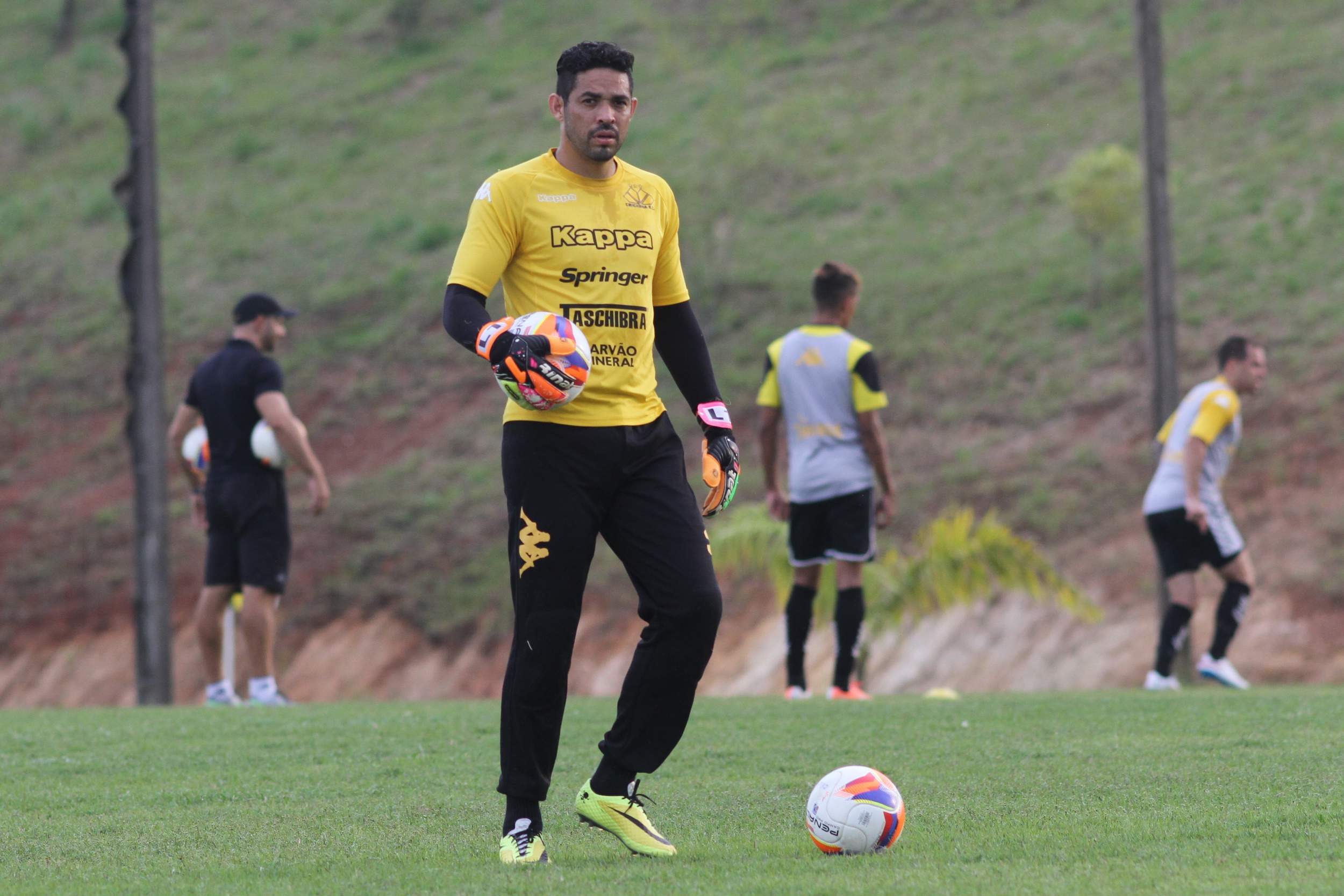 Legenda: Goleiro Luiz durante treino do Criciúma na tarde desta terça-feira (14/04) no Centro de Treinamento, no bairro Cristo Redentor