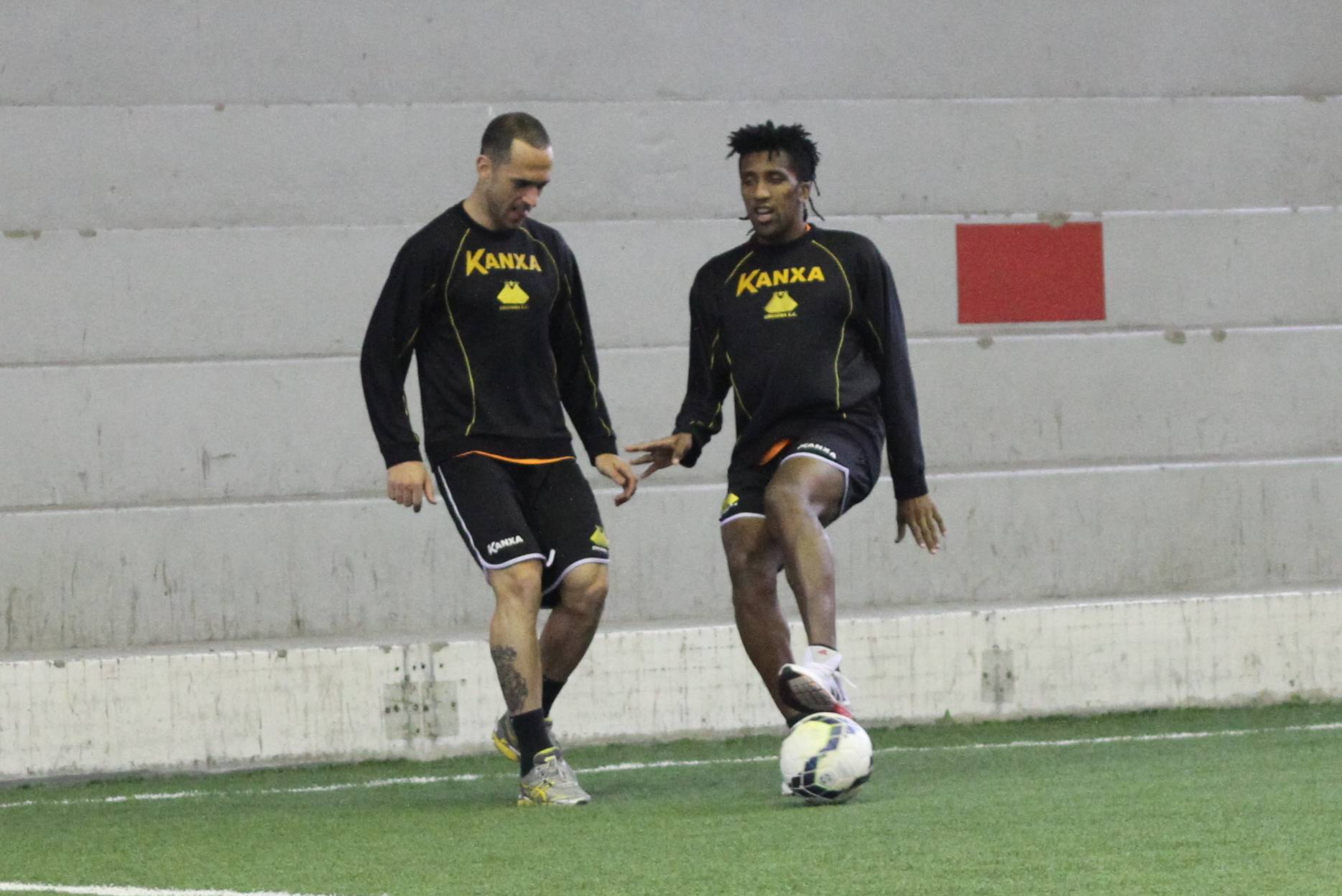 Legenda: Rafael Costa e Cortez durante treino do Criciúma no ginásio do estádio em anexo ao estádio Heriberto Hülse na manhã desta sexta-feira (14/11)