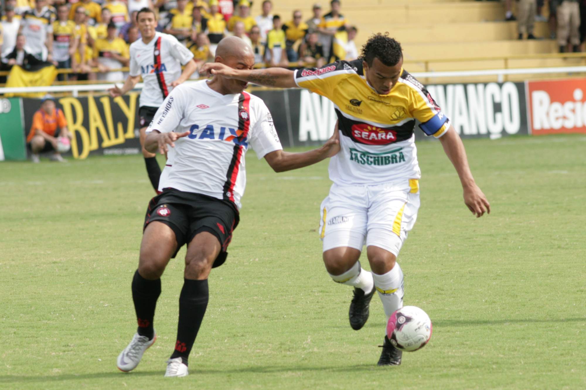 Legenda: Zé Carlos disputa a bola com a defesa do Atlético Paranaense
