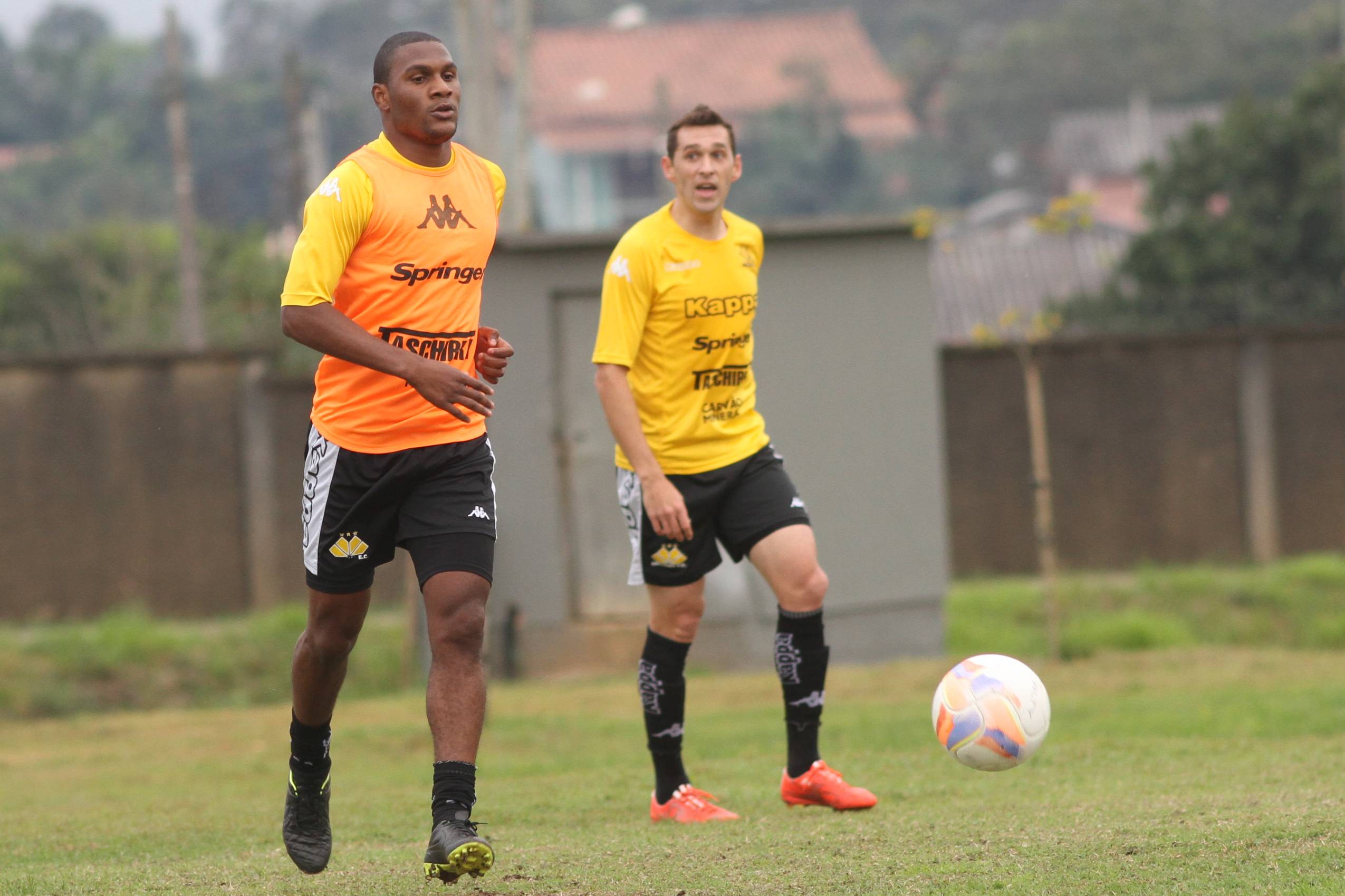 Legenda: Wellington e Juba durante treino do Criciúma na tarde desta terça-feira (04/08), no Centro de Treinamento, no bairro Cristo Redentor