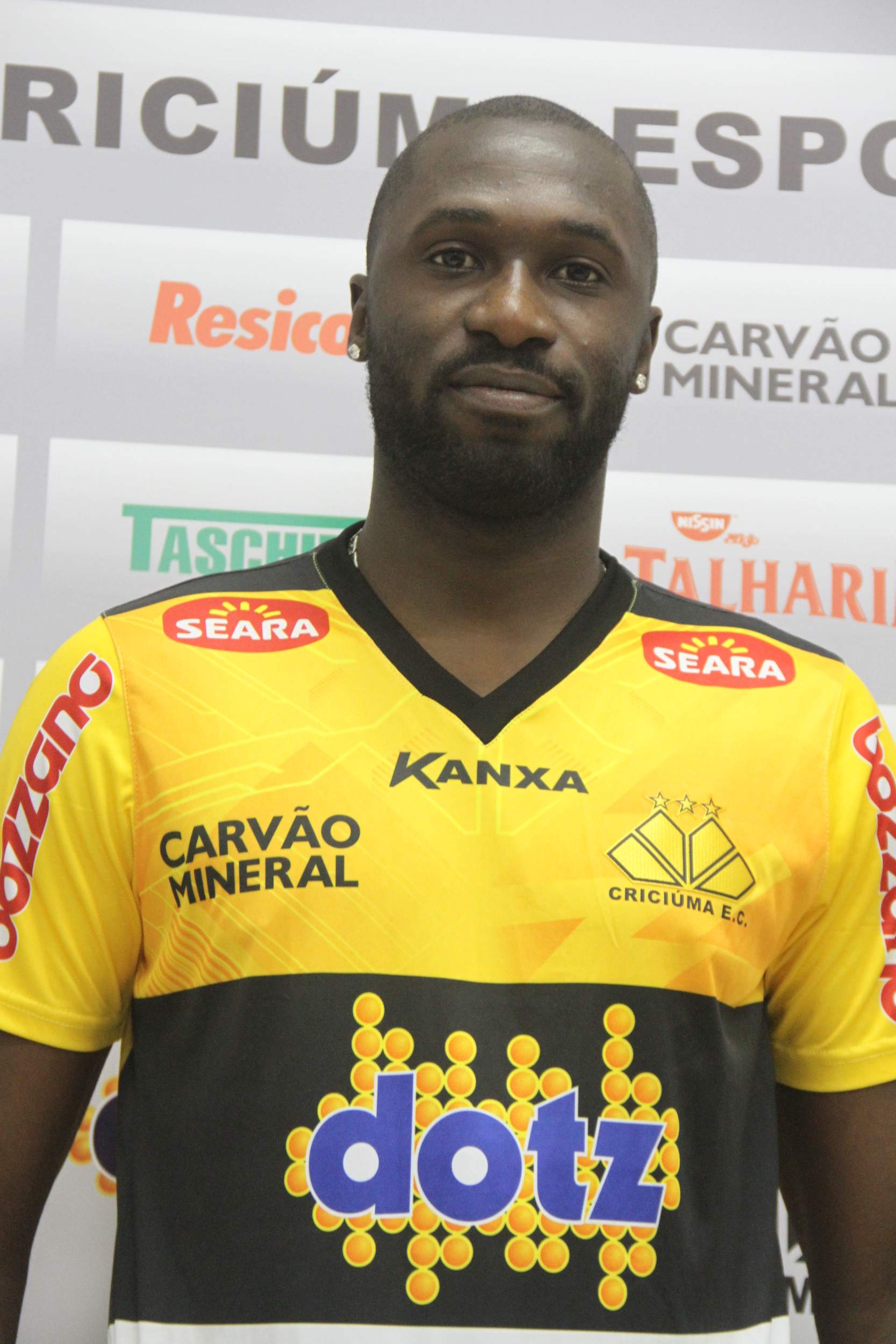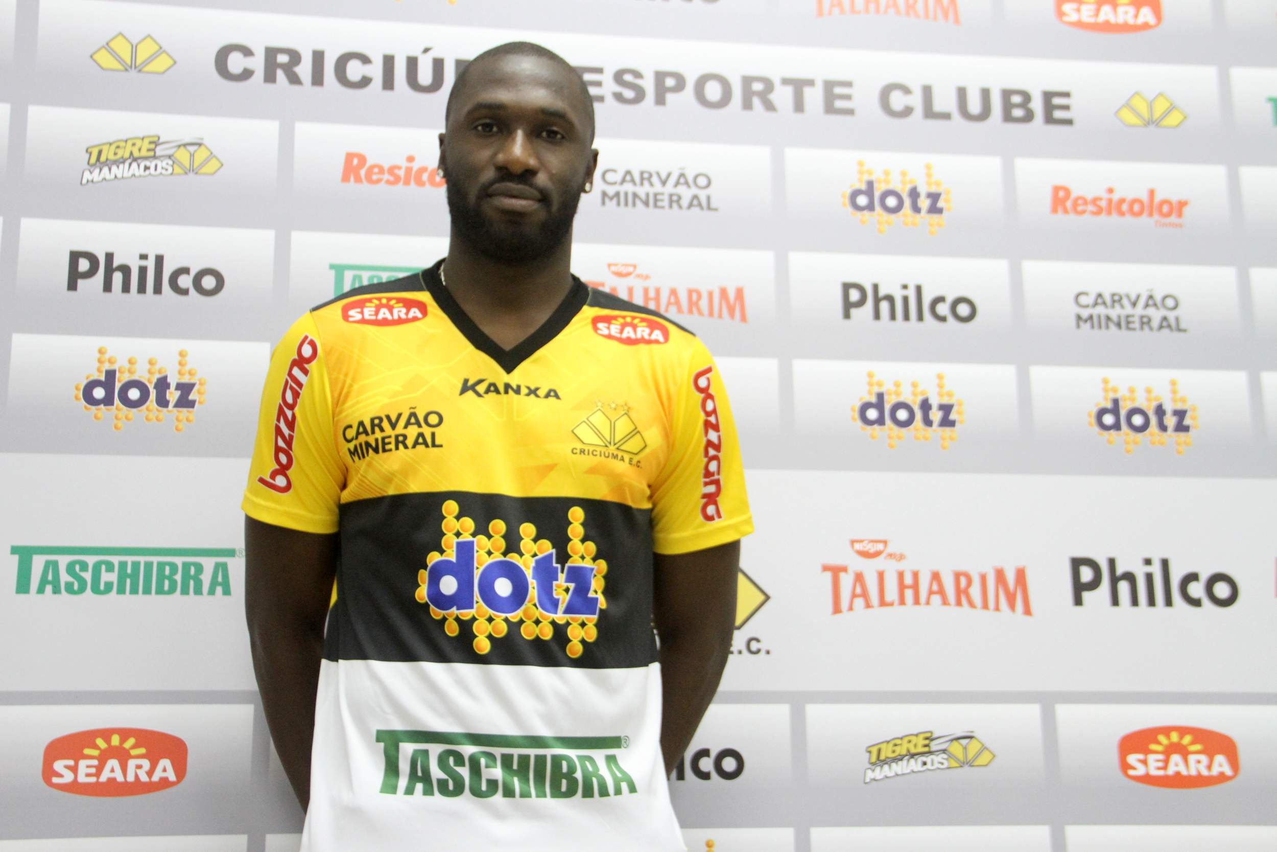 Legenda: Volante Rodrigo Souza foi apresentado oficialmente no Criciúma na tarde desta quarta-feira (23/04) na Sala de Imprensa Clésio Búrigo no estádio Heriberto Hülse