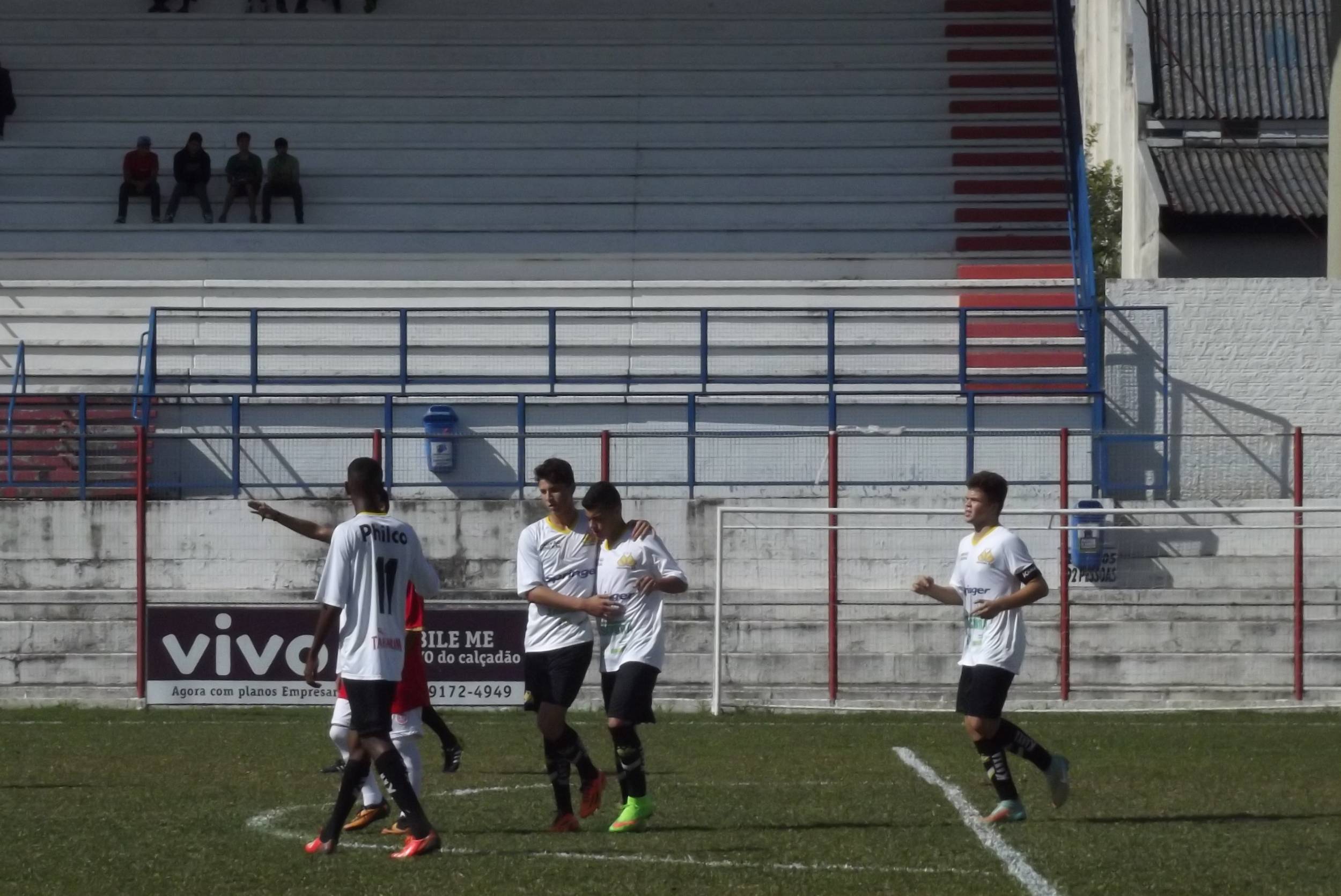 Legenda: Jogadores do Sub-17 comemoram um dos gols durante o jogo desta sexta-feira (01/05), diante do Internacional de Lages, no estádio Vidal Ramos Júnior.