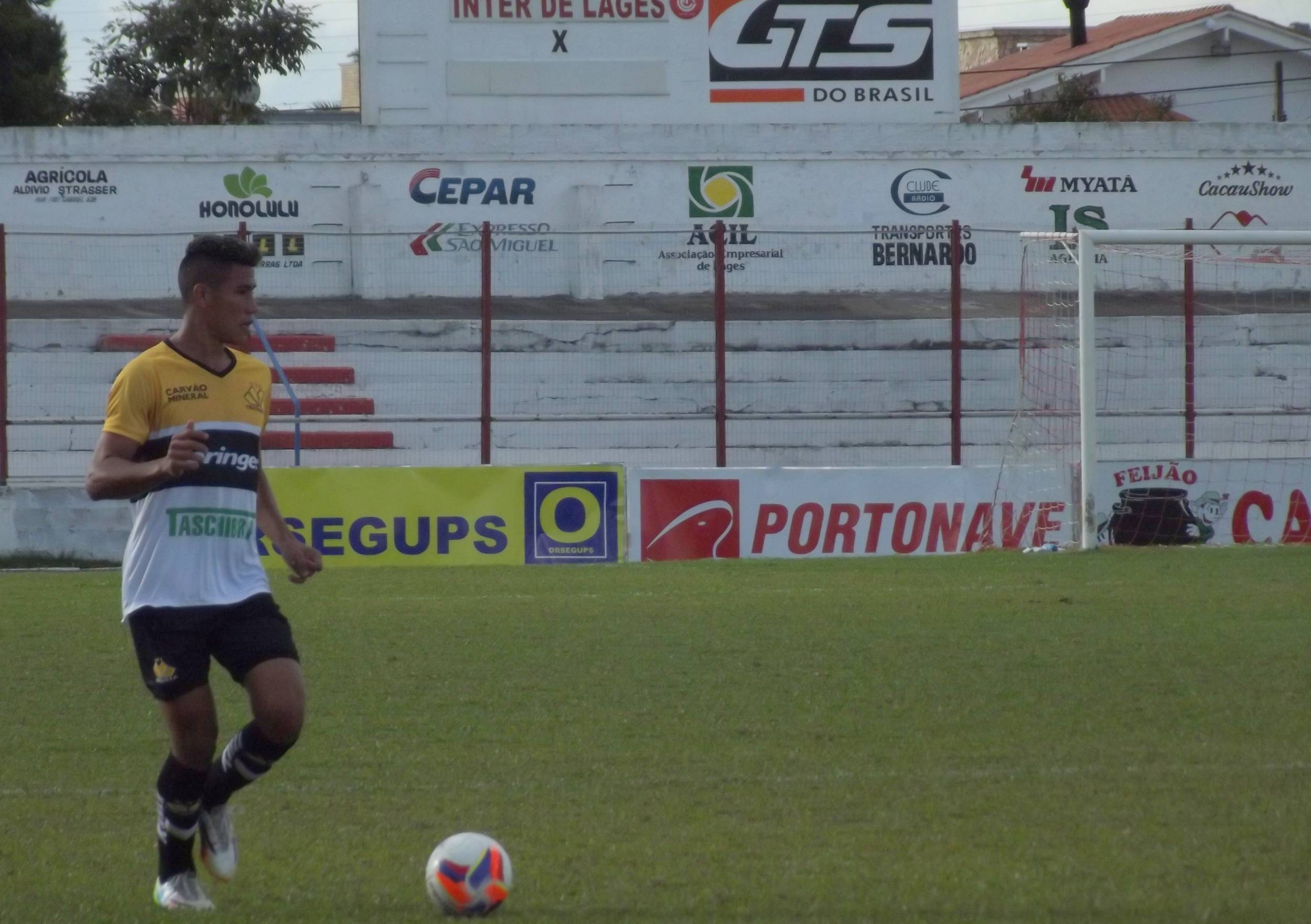 Legenda: Lateral direito do Sub-20, Mota, durante o jogo desta sexta-feira (01/05), diante do Internacional de Lages, no estádio Vidal Ramos Júnior.