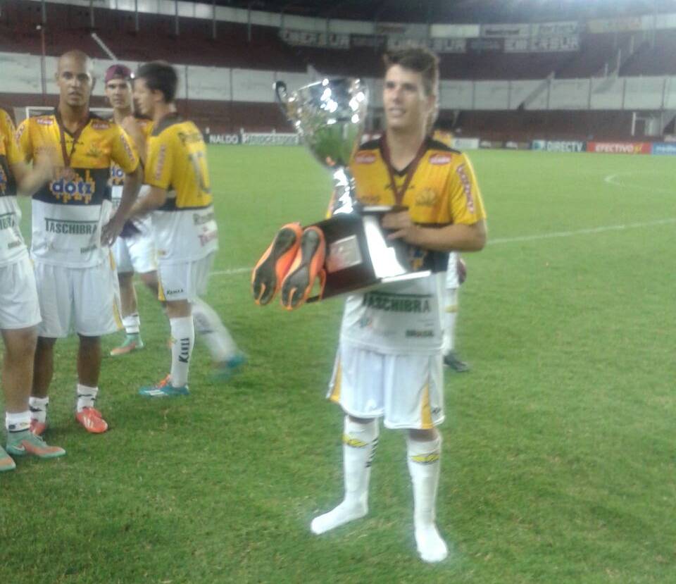 Legenda: Atacante Augusto depois da conquista do Torneio Internacional nesta terça-feira (16/12).
