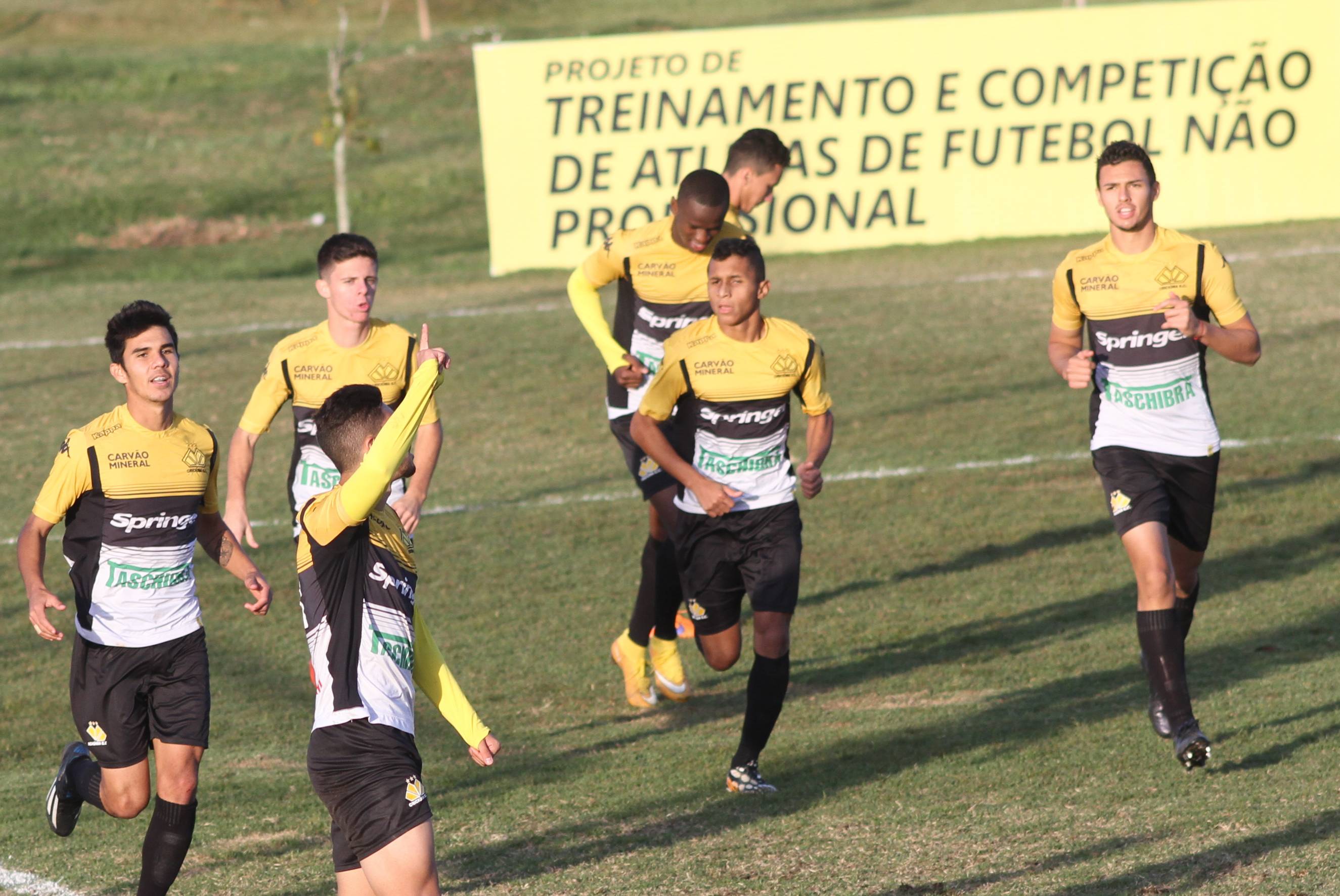 Legenda: Jogadores comemoram o segundo gol de Kalil durante jogo entre Criciúma e Inter de Lages pelo Campeonato Catarinense Sub-20 realizado na tarde deste sábado (04/07) no Centro de Treinamento, no bairro Cristo Redentor