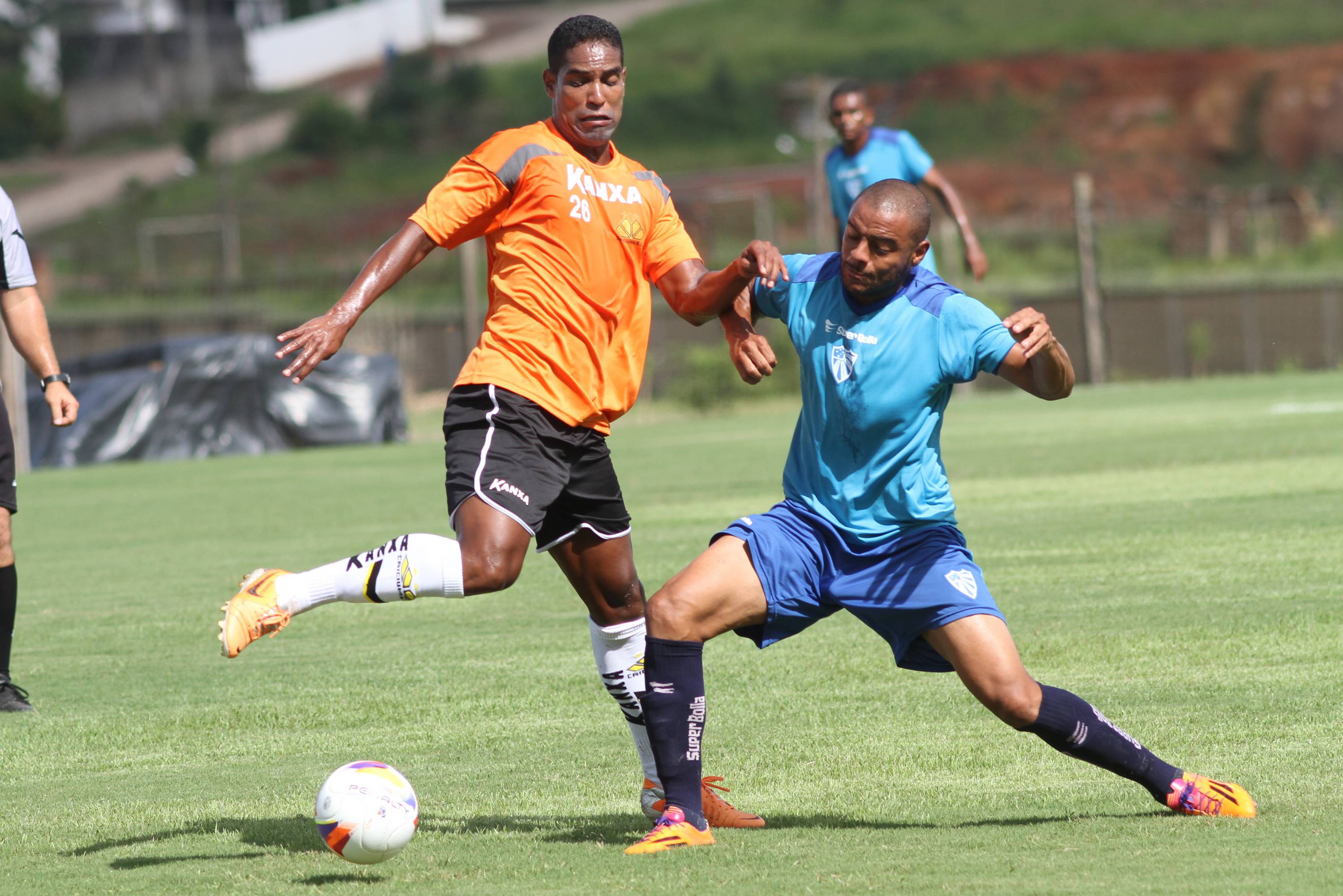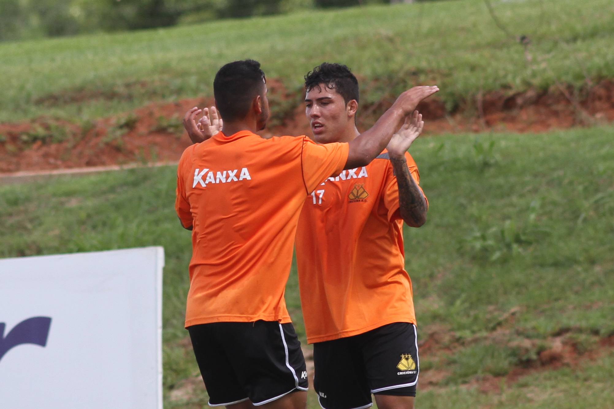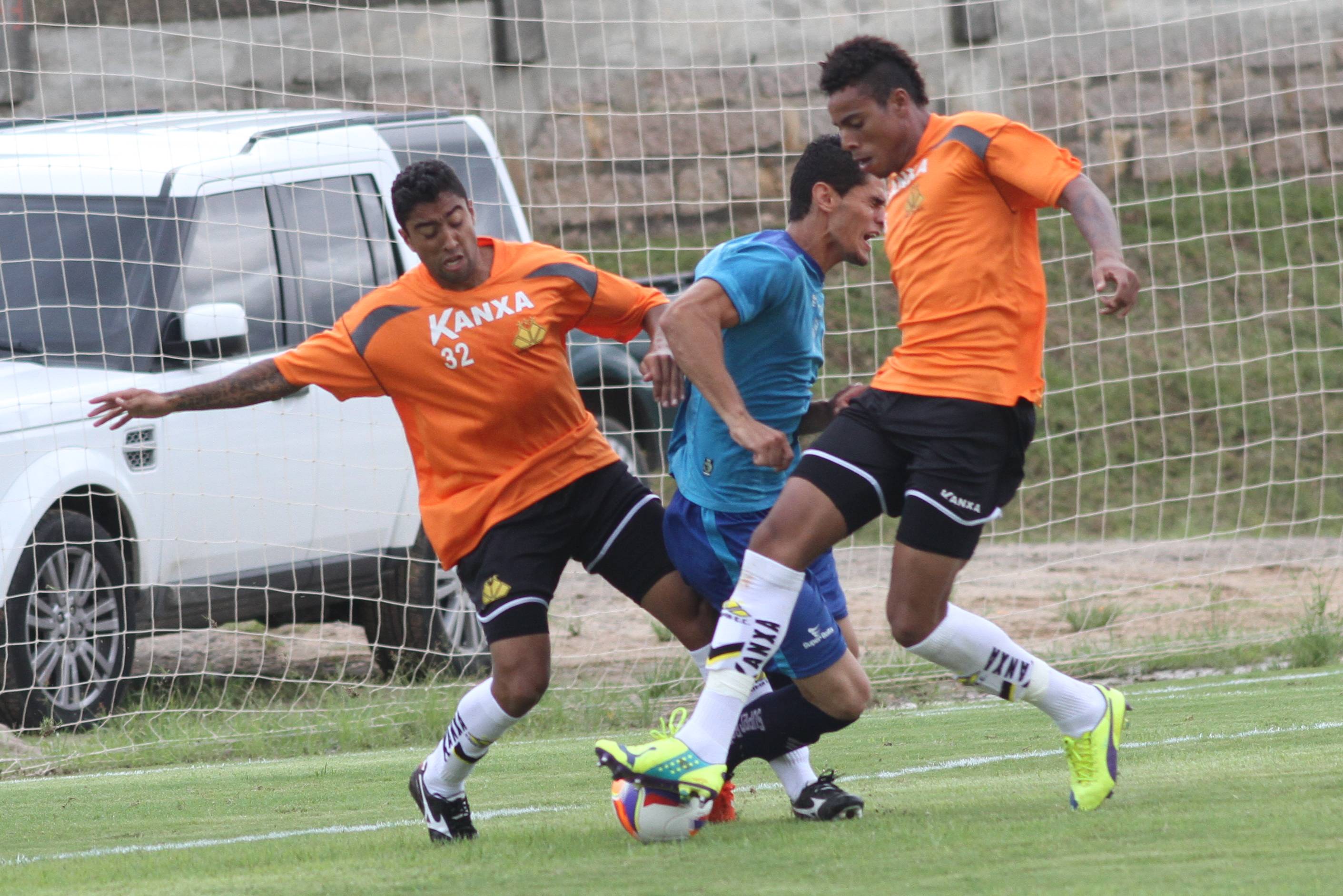 Legenda: Atacantes Maurinho e Gustavo durante a segunda parte do jogo treino entre Criciúma e Cruzeiro (RS) na tarde desta quarta-feira (21/01) no Centro de Treinamento, no bairro Cristo Redentor