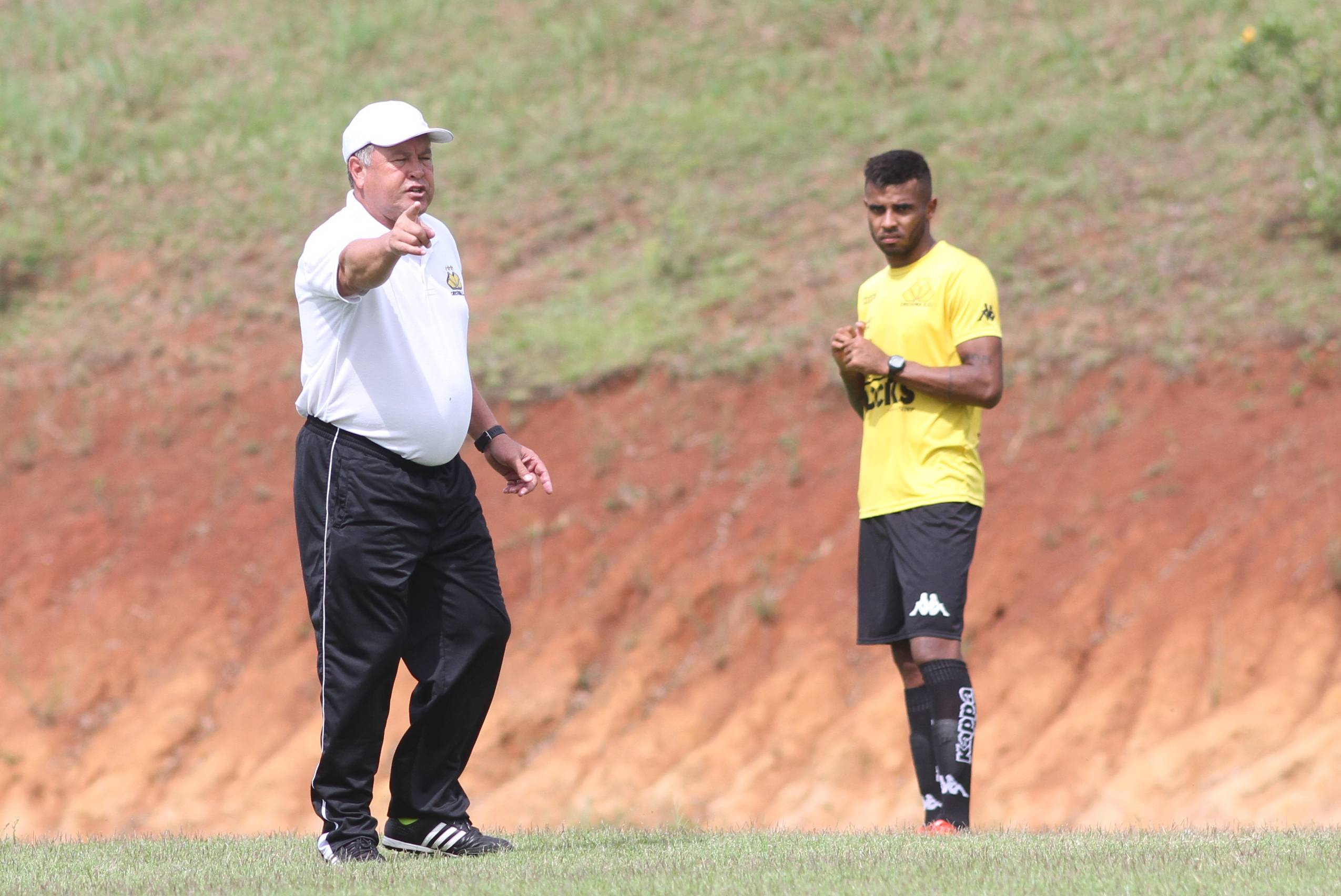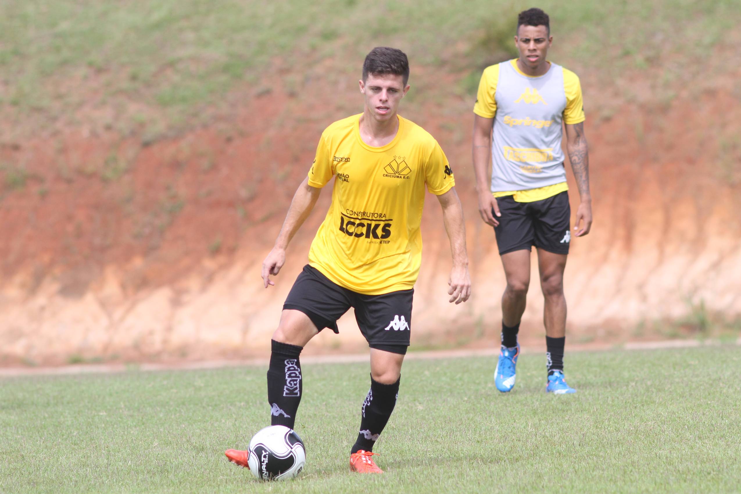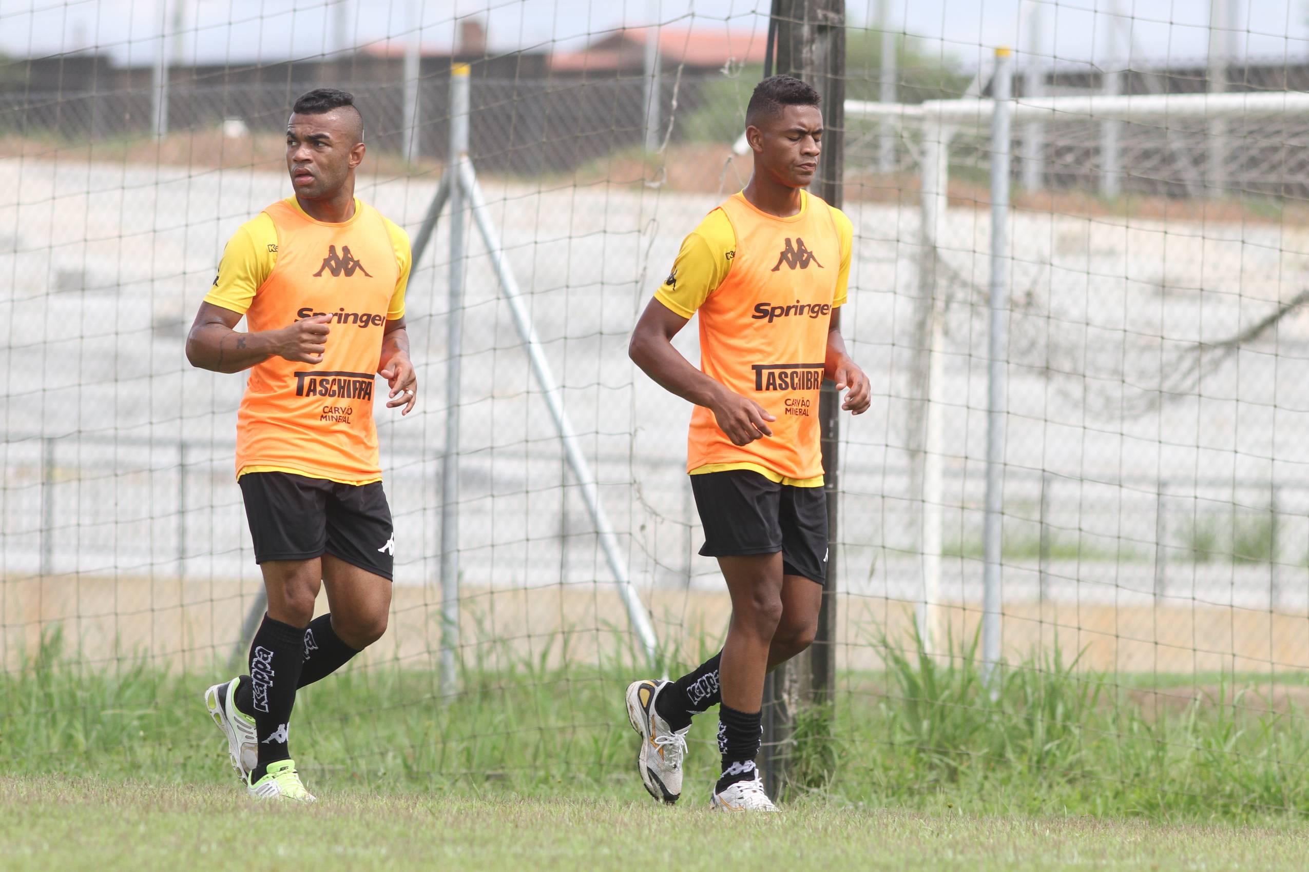 Legenda: Crispim e Jean Mangabeira durante treino do Criciúma na manhã desta terça-feira (09/02), no Centro de Treinamento, no bairro Cristo Redentor