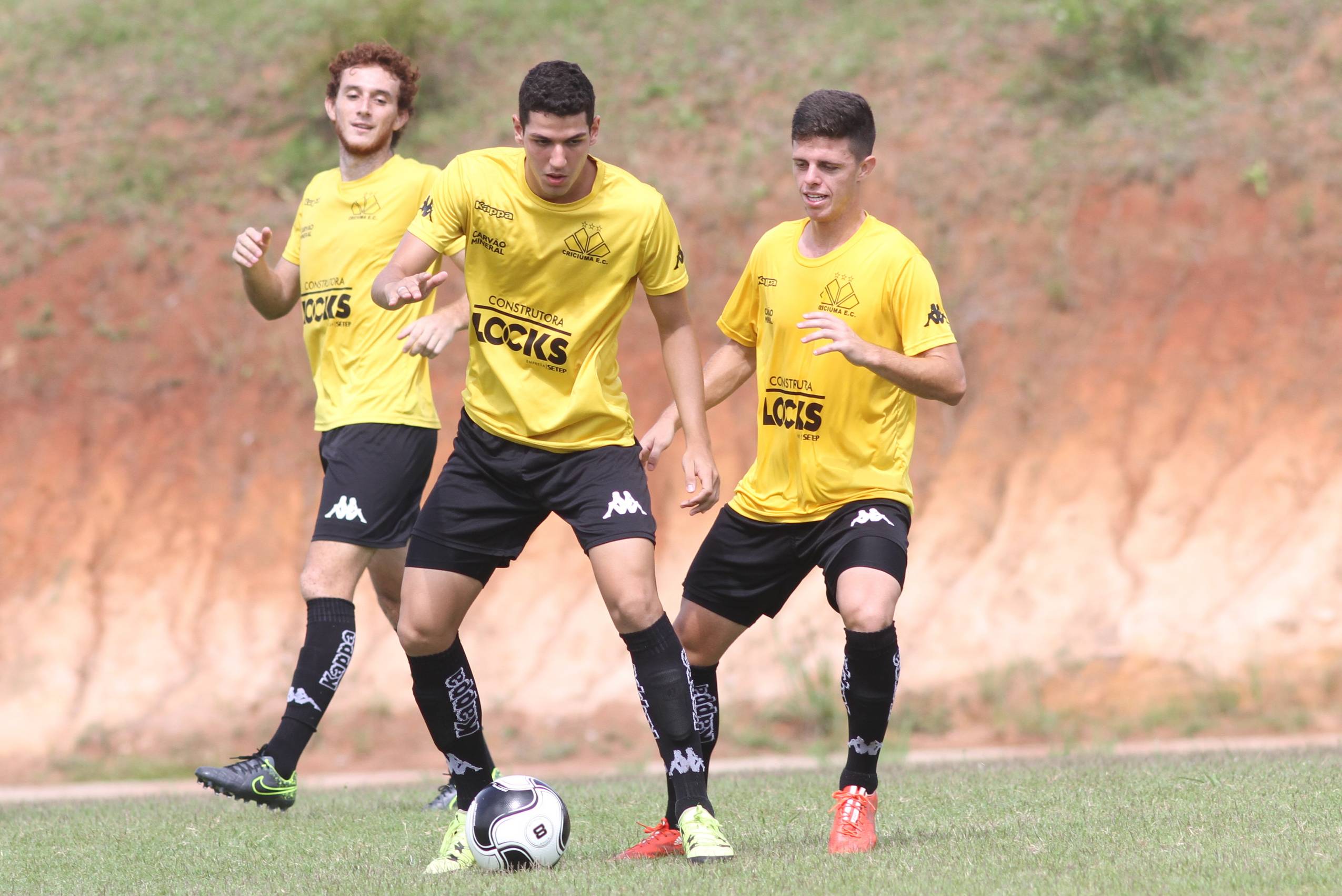 Legenda: Ianson, Nino e Eduardo durante treino do Criciúma na manhã desta terça-feira (09/02), no Centro de Treinamento, no bairro Cristo Redentor