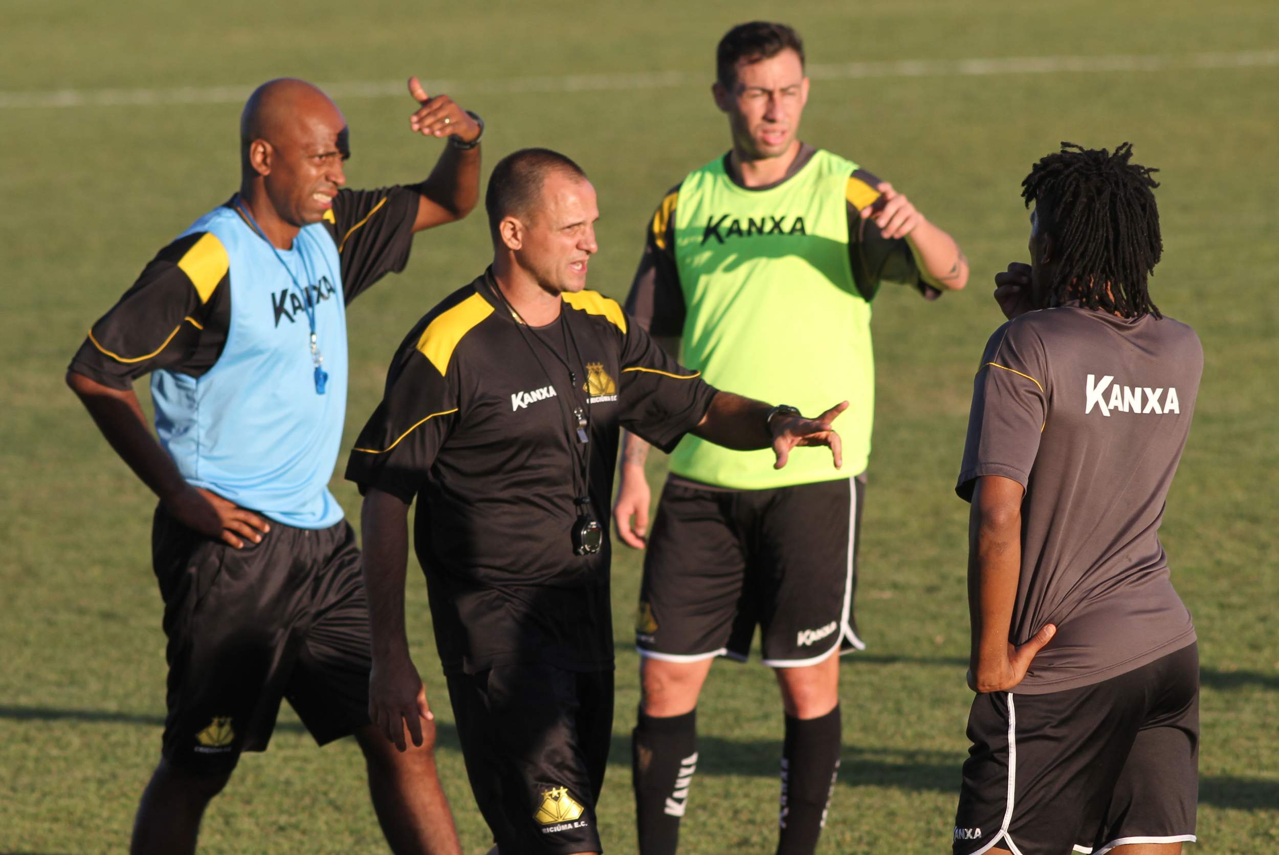Legenda: Técnico Wagner Lopes com os atacantes Bruno Lopes (E) e Silvinho (D) durante treino no CT na tarde desta quinta-feira (01/05)