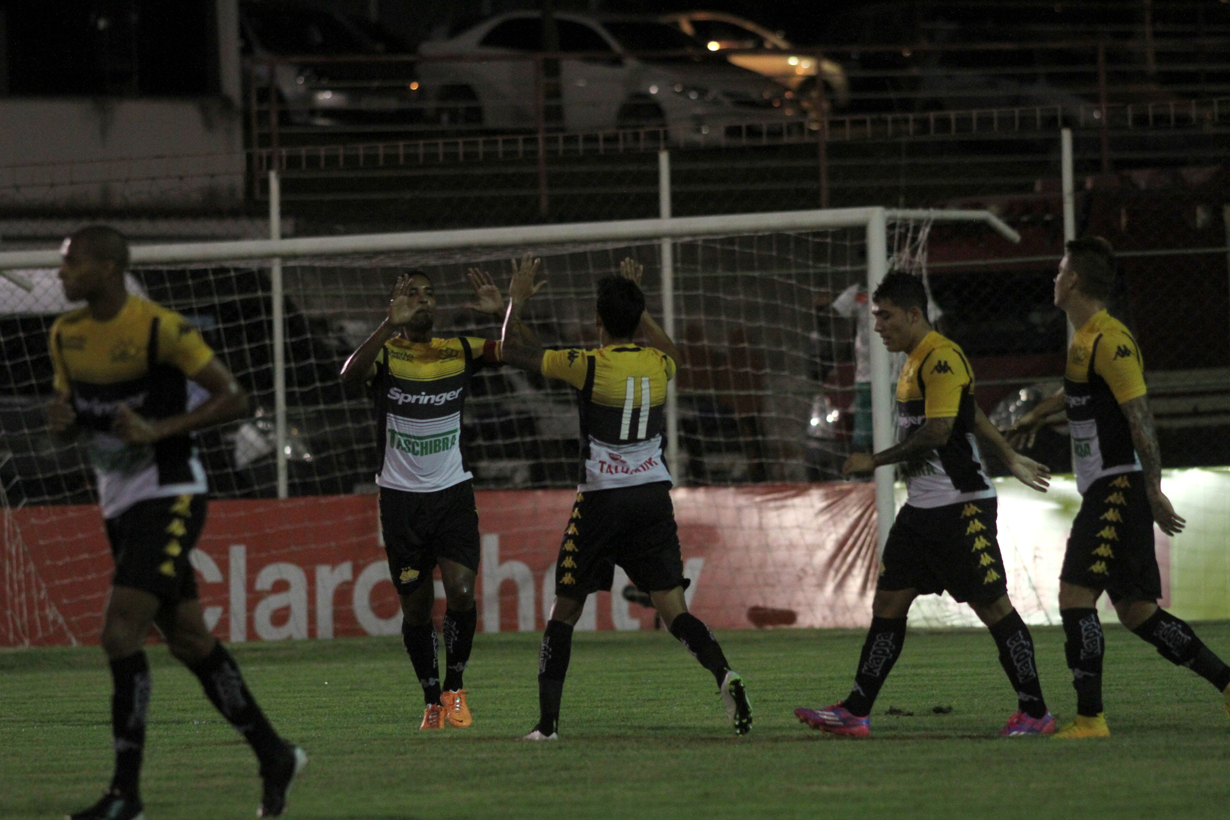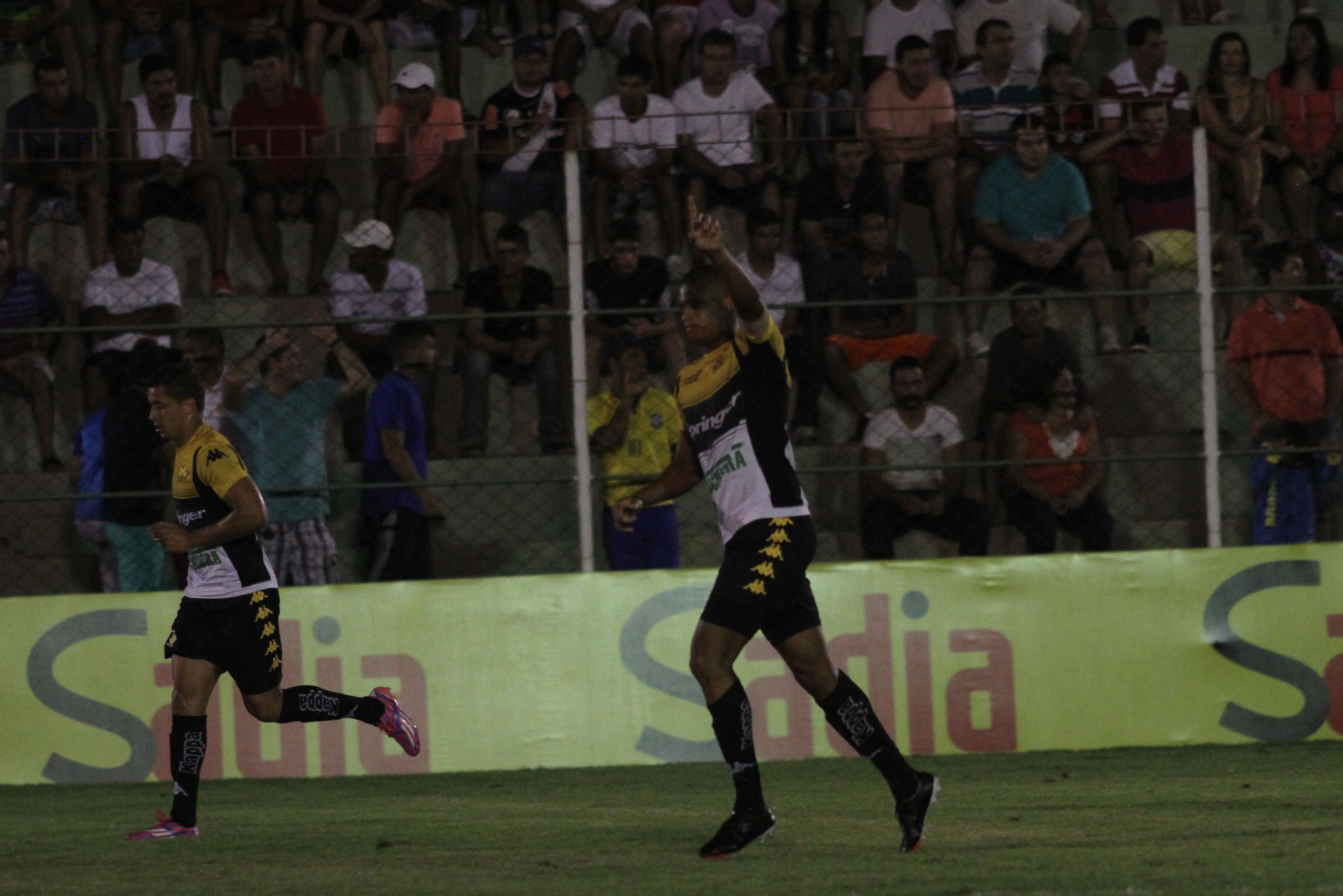 Legenda: Zagueiro Joílson comemora um dos gols durante o jogo desta quarta-feira (18/03).