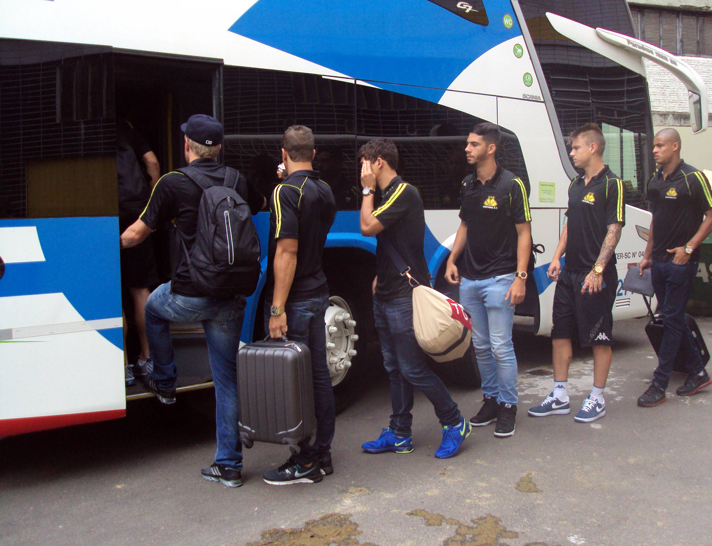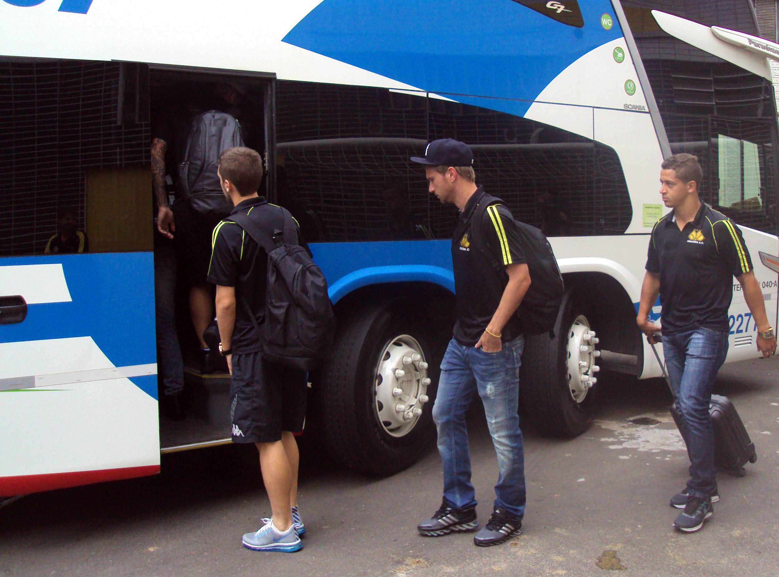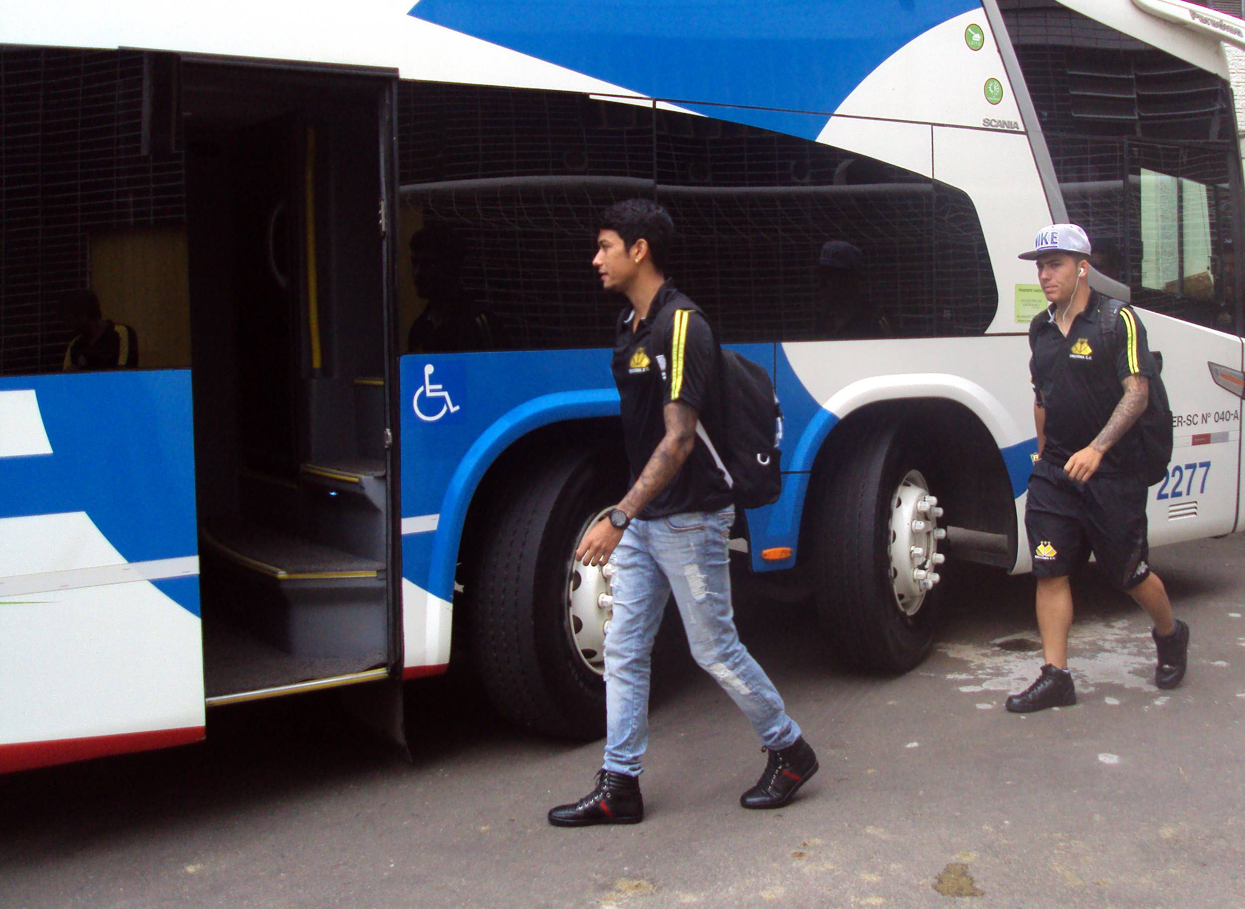 Legenda: jogadores no embarque para o jogo desta quarta-feira (18/03).