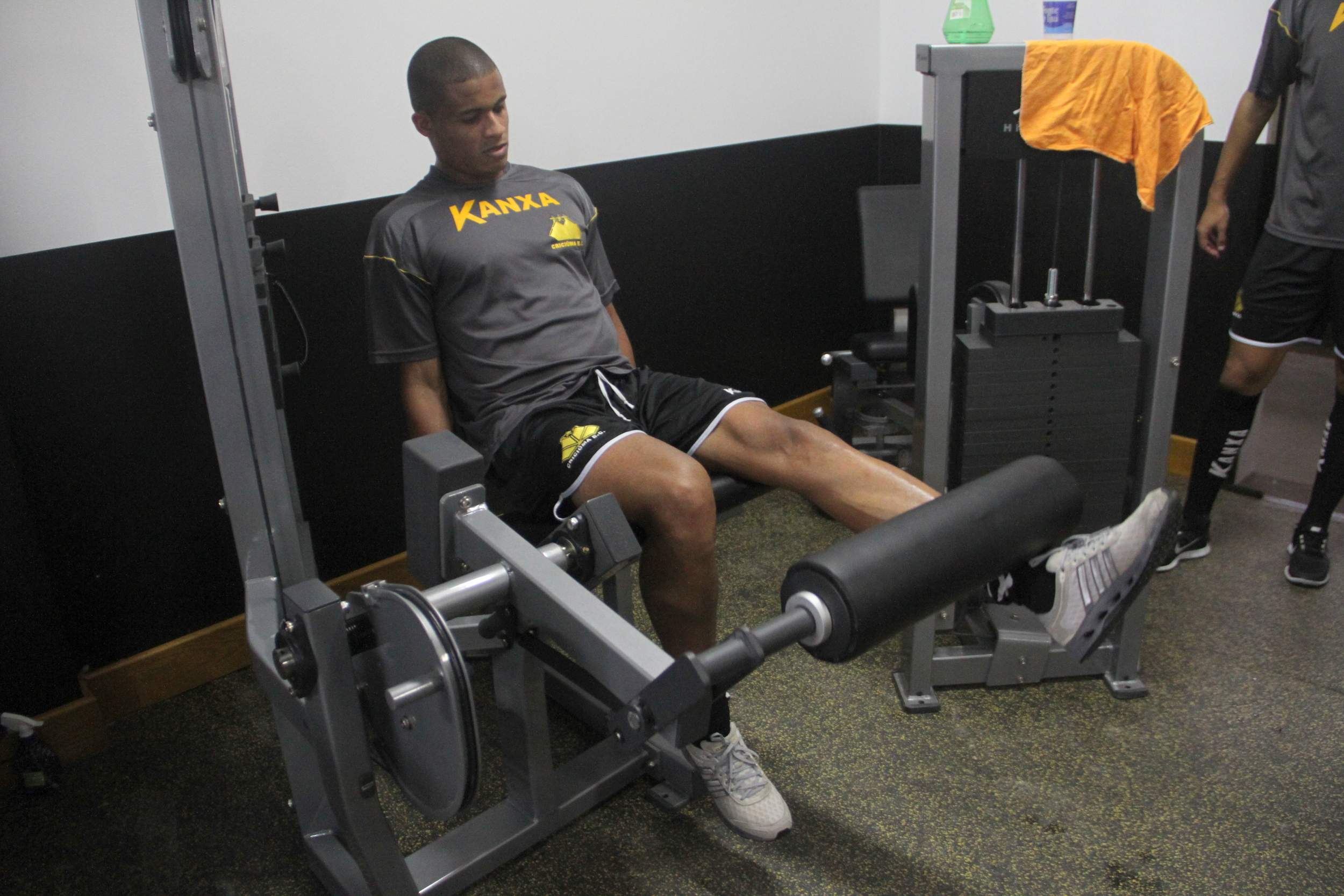 Legenda: Zagueiro Joílson durante treino na academia do estádio Heriberto Hülse na tarde desta segunda-feira (29/09)