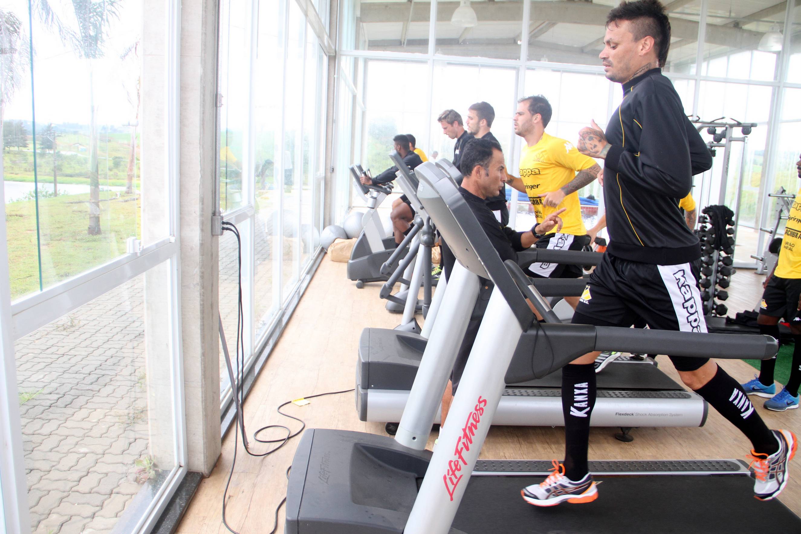 Legenda: Atletas participam de trabalho de força na academia do CT do Atlético Sorocaba na manhã desta segunda-feira (04/05)