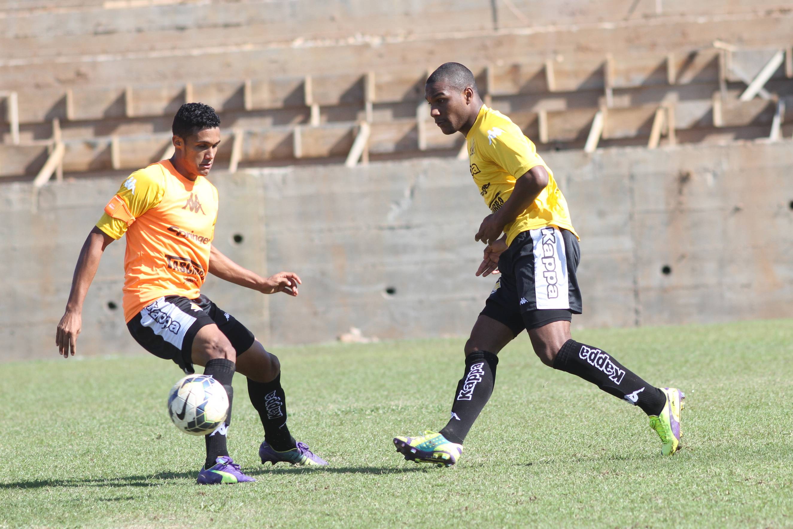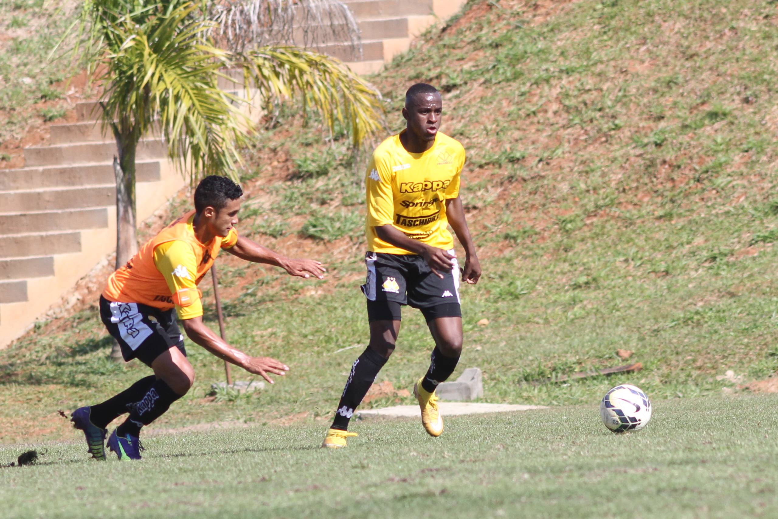Legenda: Cristiano e Wellington durante treino do Criciúma na manhã deste domingo (19/07) no Centro de Treinamento, no bairro Cristo Redentor