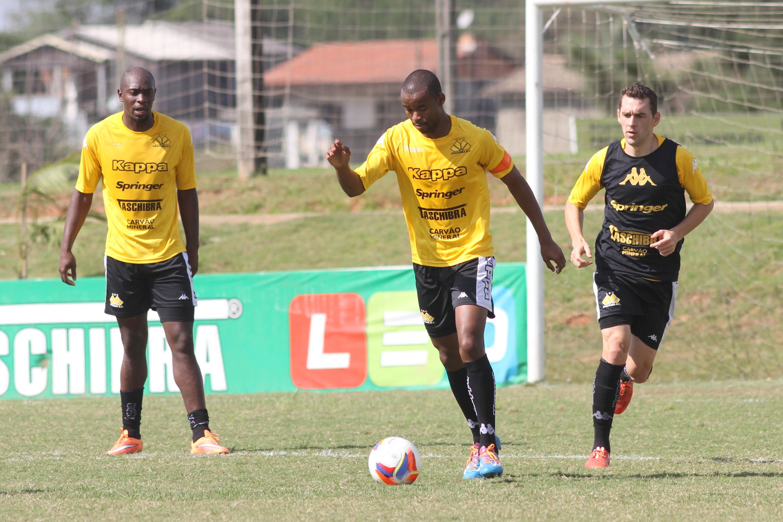 Legenda: Tiago Adan e Jonas durante treino do Criciúma na manhã desta terça-feira (18/08), no Centro de Treinamento, no bairro Cristo Redentor