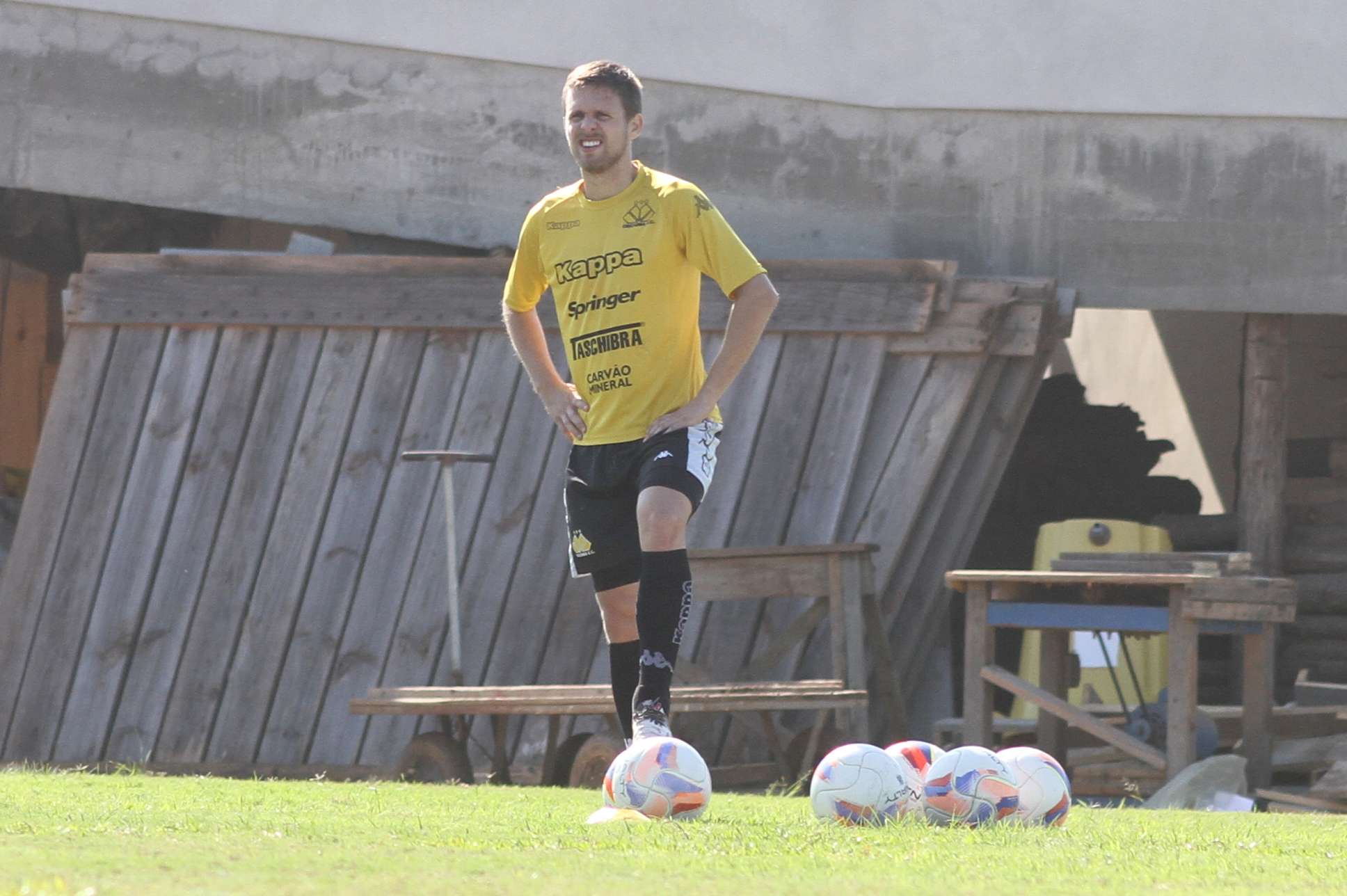 Legenda: Volante Marcão durante treino do Criciúma na manhã deste domingo (09/08), no Centro de Treinamento, no bairro Cristo Redentor
