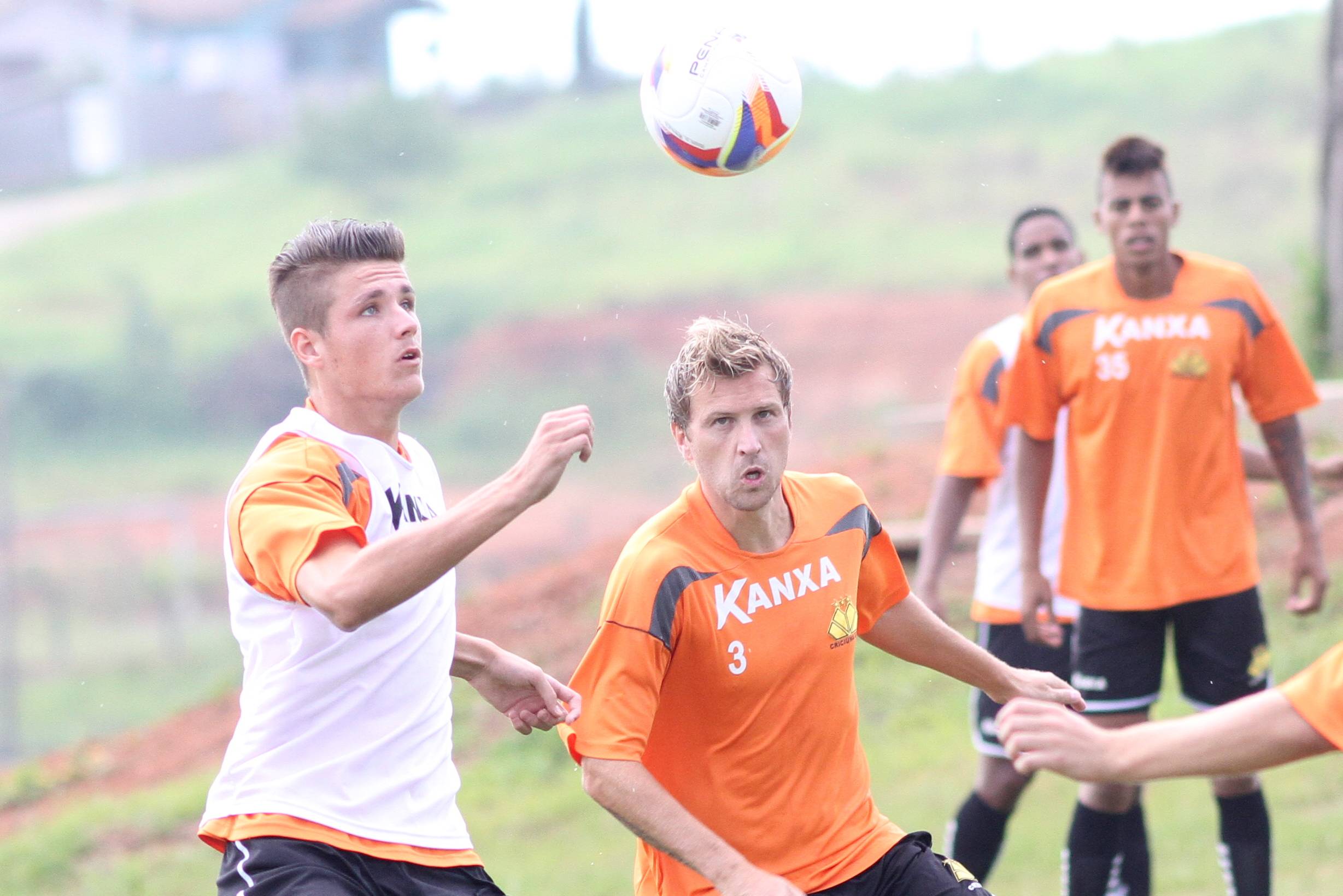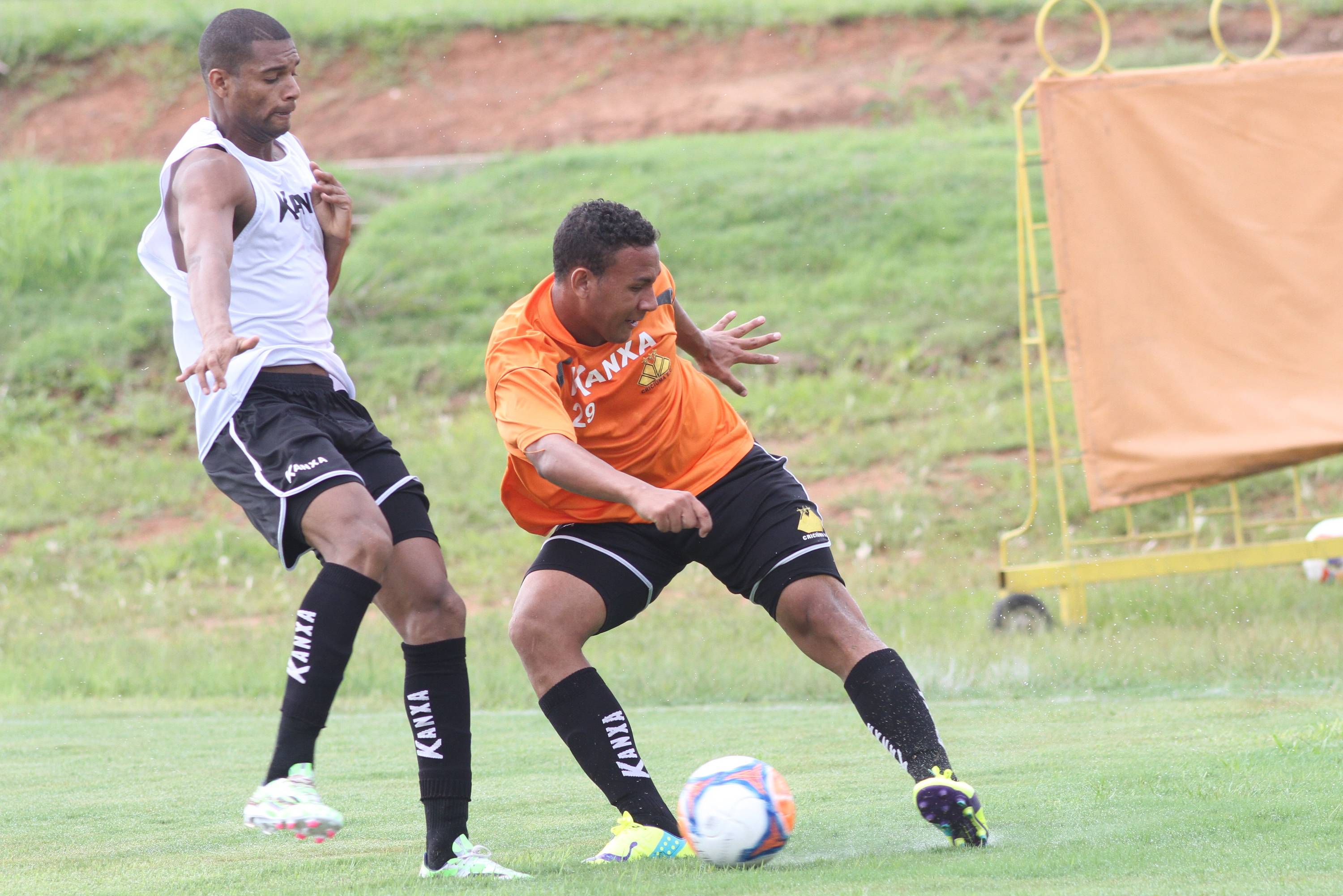 Legenda: Maicon Silva e Rafael Rodrigues durante treino do Criciúma na manhã desta quarta-feira (04/02) no Centro de Treinamento, no bairro Cristo Redentor