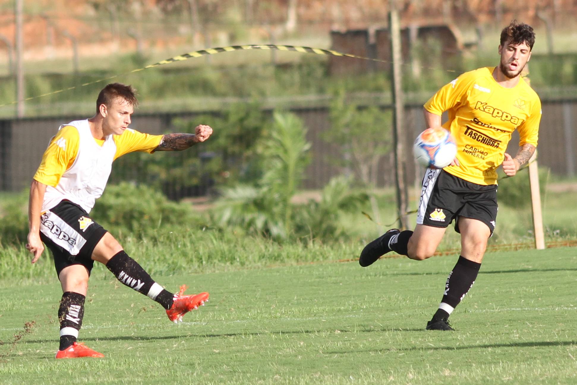 Legenda: Atacante Róger Guedes e zagueiro Ianson durante treino do Criciúma na tarde desta segunda-feira (23/02) no Centro de Treinamento, no bairro Cristo Redentor
