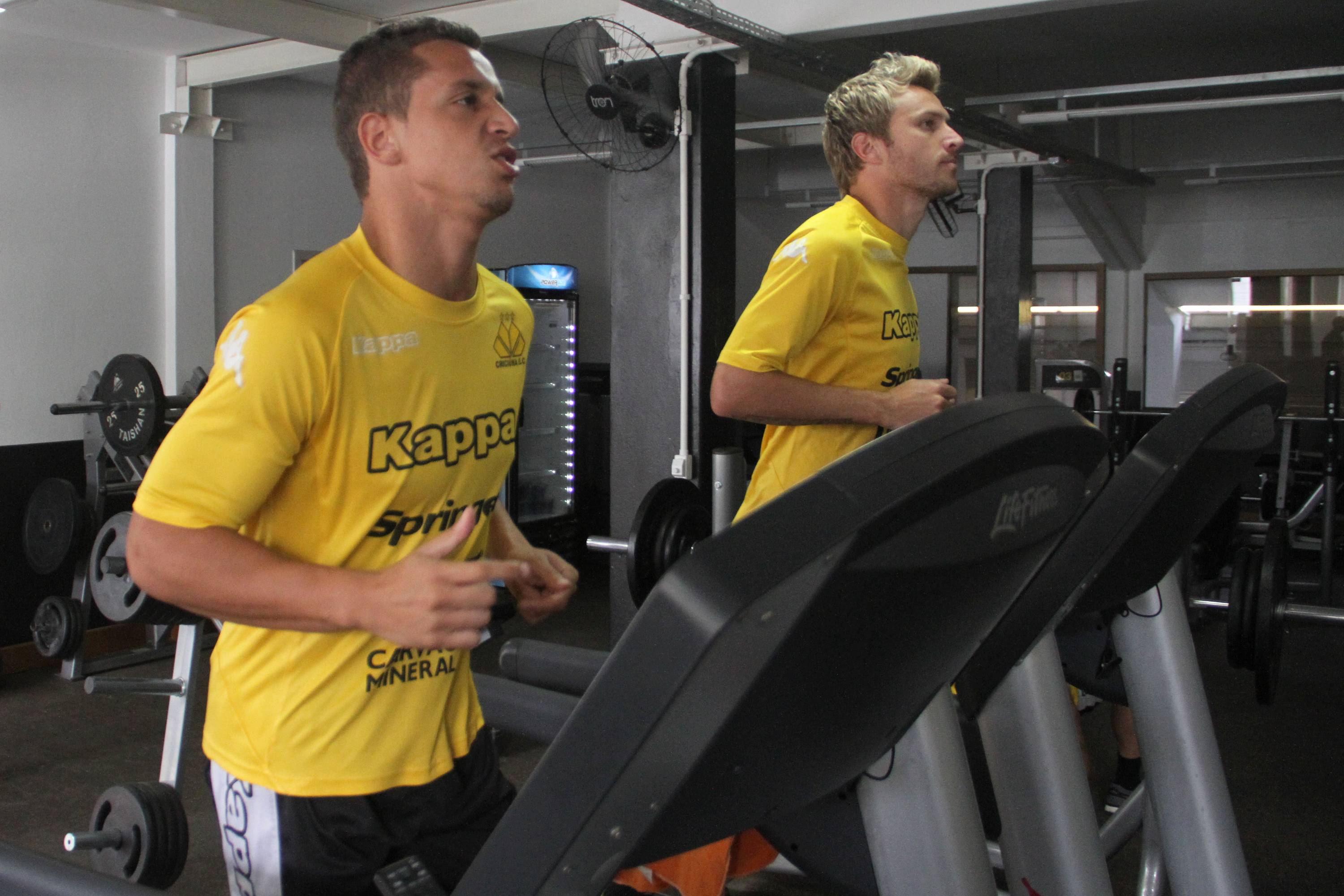 Legenda: Atletas do Tigre durante trabalho de força na academia do estádio Heriberto Hülse na tarde desta segunda-feira (06/04)