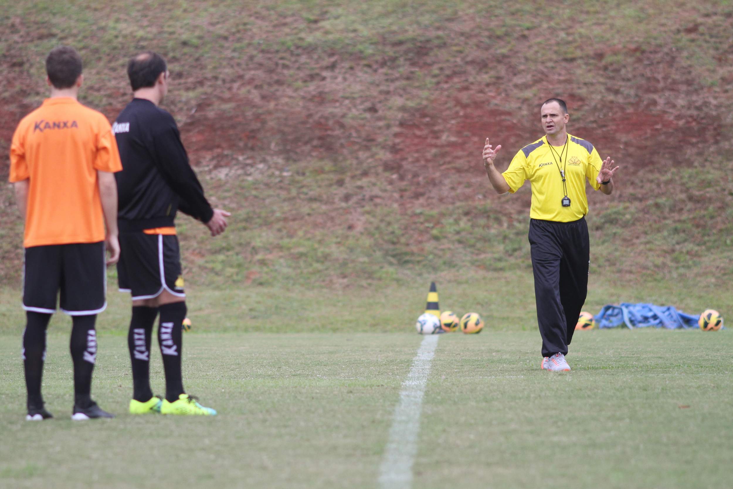 Legenda: Técnico Wagner Lopes conversa com os atletas durante treino na manhã desta quinta-feira no Centro de Treinamento