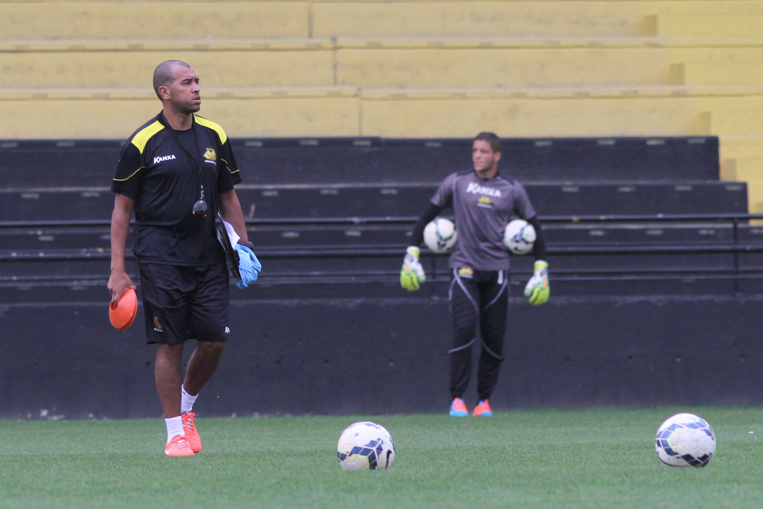 Legenda: Maurinho e Joílson durante treino do Criciúma no estádio Heriberto Hülse na tarde desta quinta-feira (13/11)