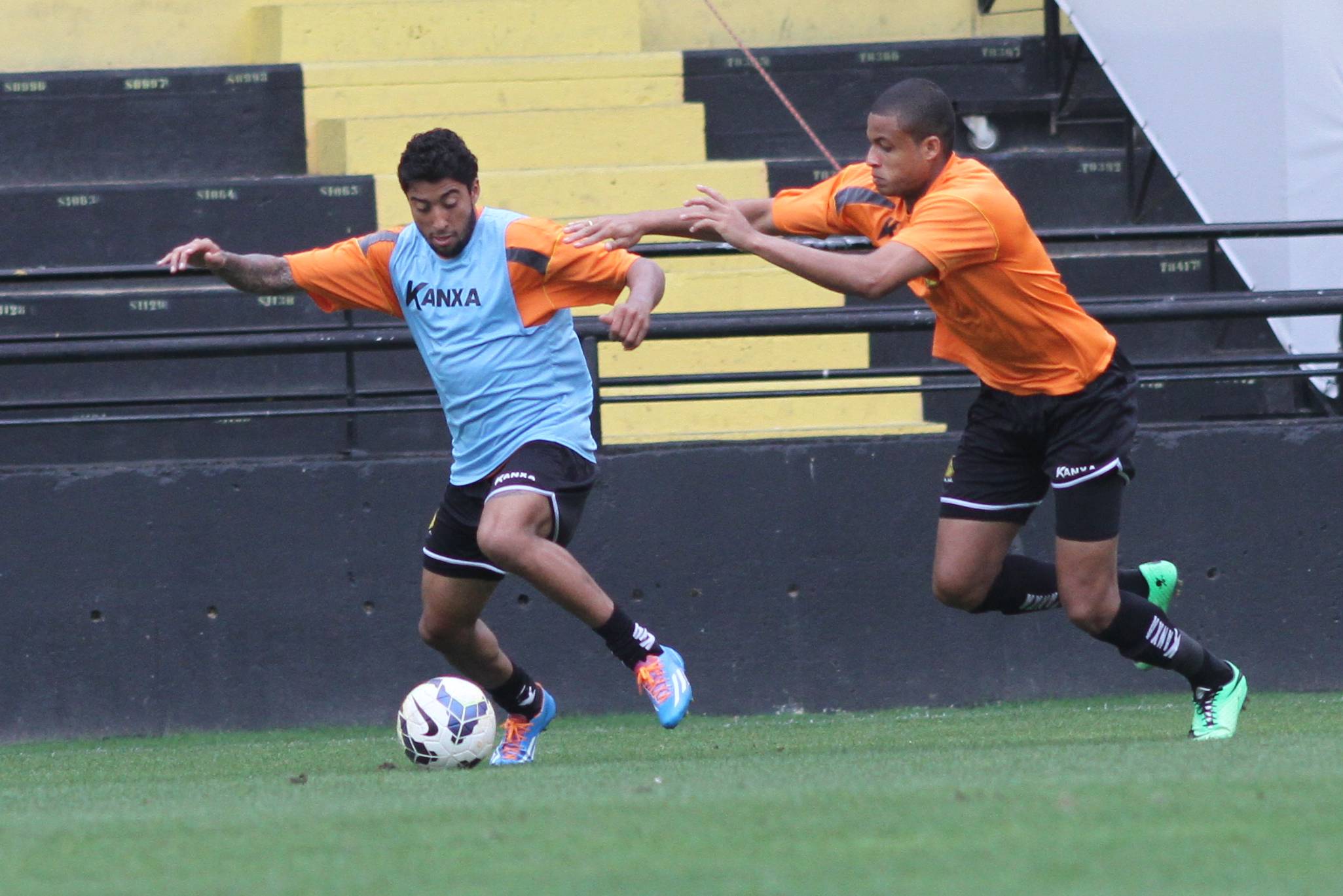 Legenda: Ricardinho e Luis Felipe durante treino do Criciúma no estádio Heriberto Hülse na tarde desta quinta-feira (13/11)