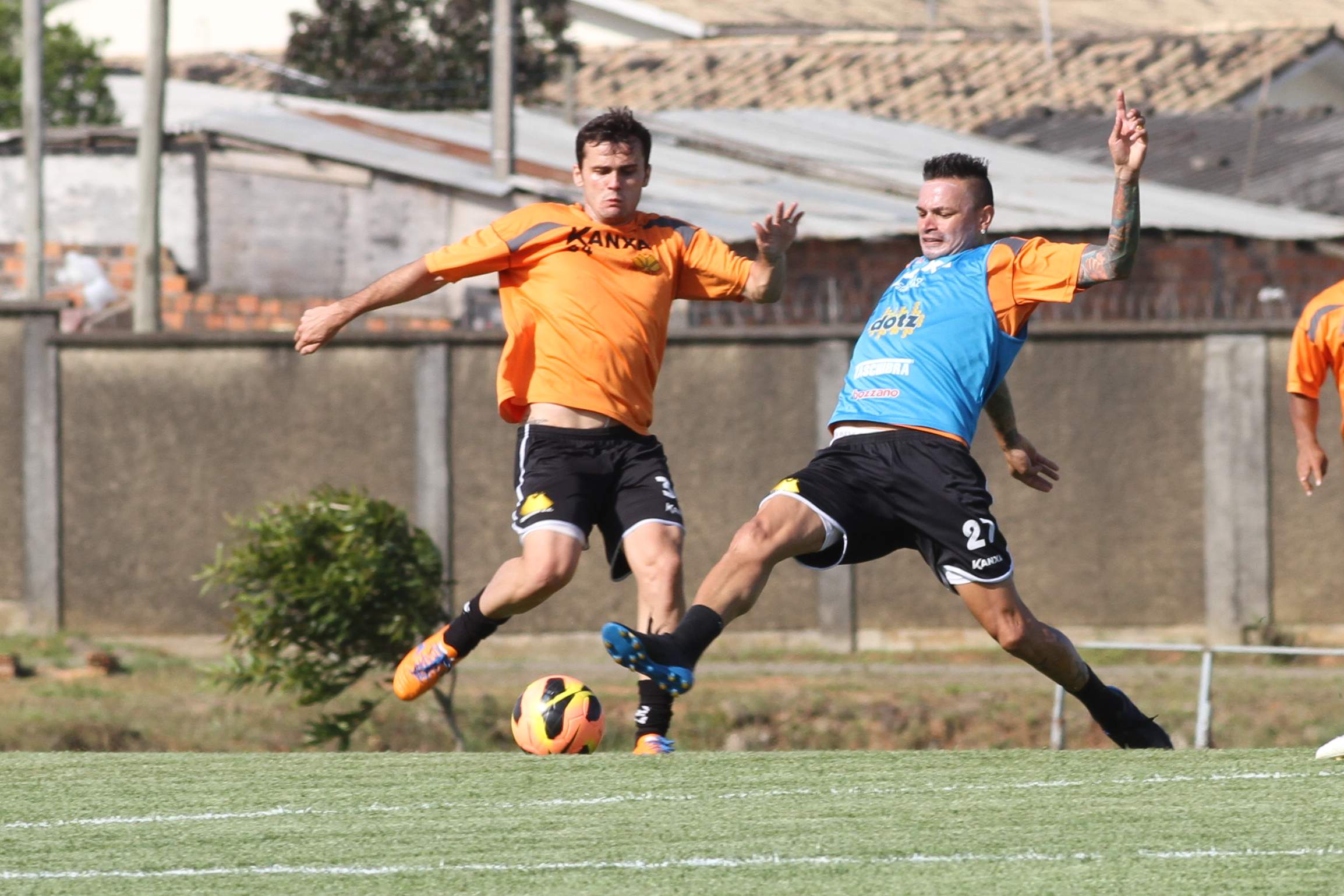 Legenda: Atacante Fabinho e meia Ricardinho durante treino do Criciúma na tarde desta quarta-feira (30/10) no Centro de Treinamento, no bairro Cristo Redentor
